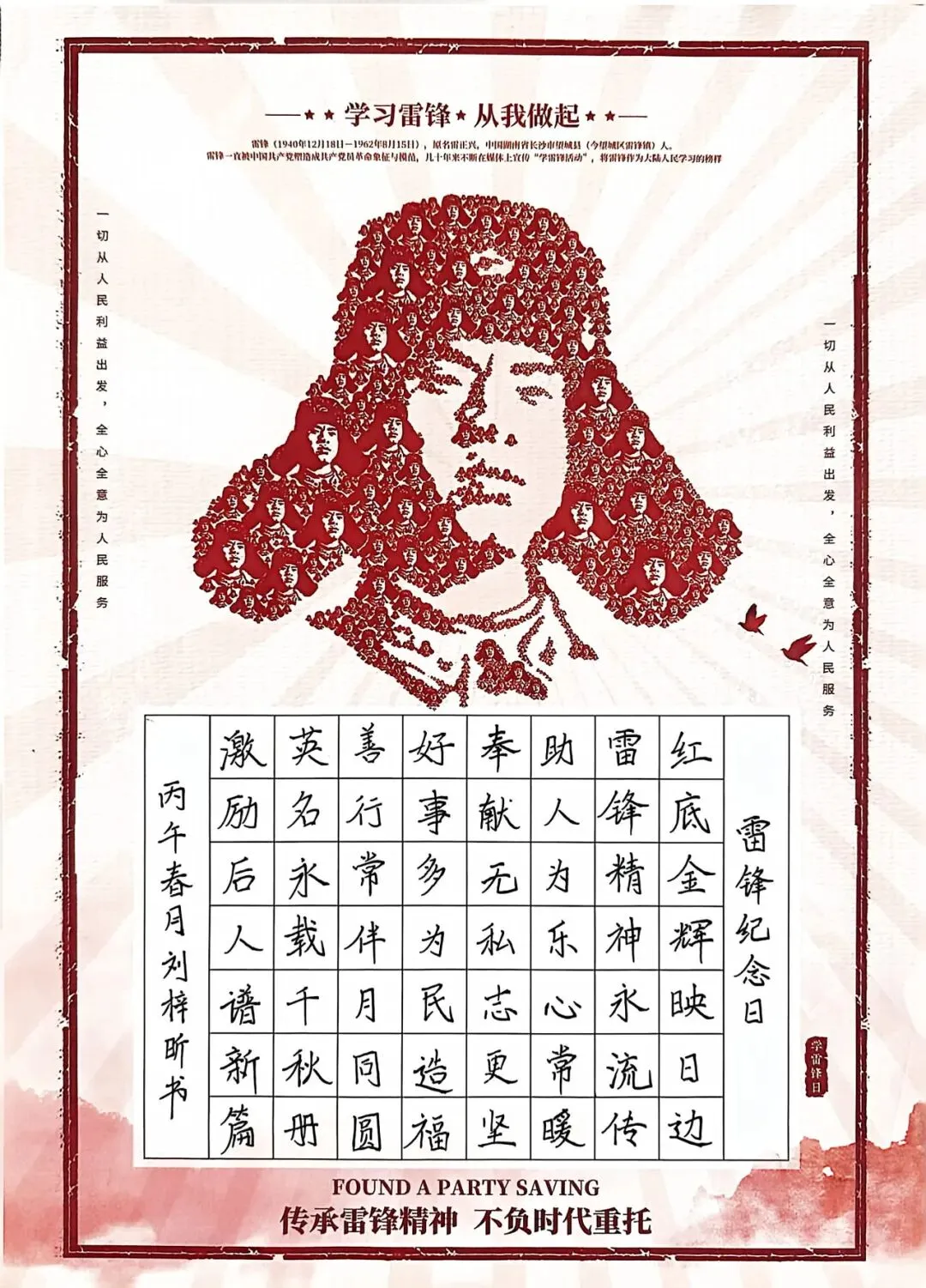 为深入弘扬雷锋精神,引导学生树立奉献、友爱、互助、进步的价值追求,近日,南昌大学附属学校安义分校开展 “弘扬雷锋精神,绘写少年担当” 主题小报、硬笔书法作品评选活动。