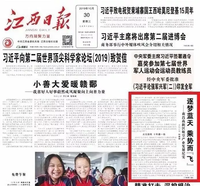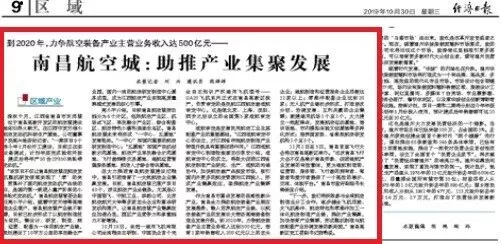 10月30日,《经济日报》在第9版面刊登了题为《南昌航空城:助推产业集聚发展》的报道;《江西日报》也在头版刊登了题为《逐梦蓝天 乘势而“飞”》, 总结了南昌航空城的发展成就,助力2019年南昌飞行大会开幕。