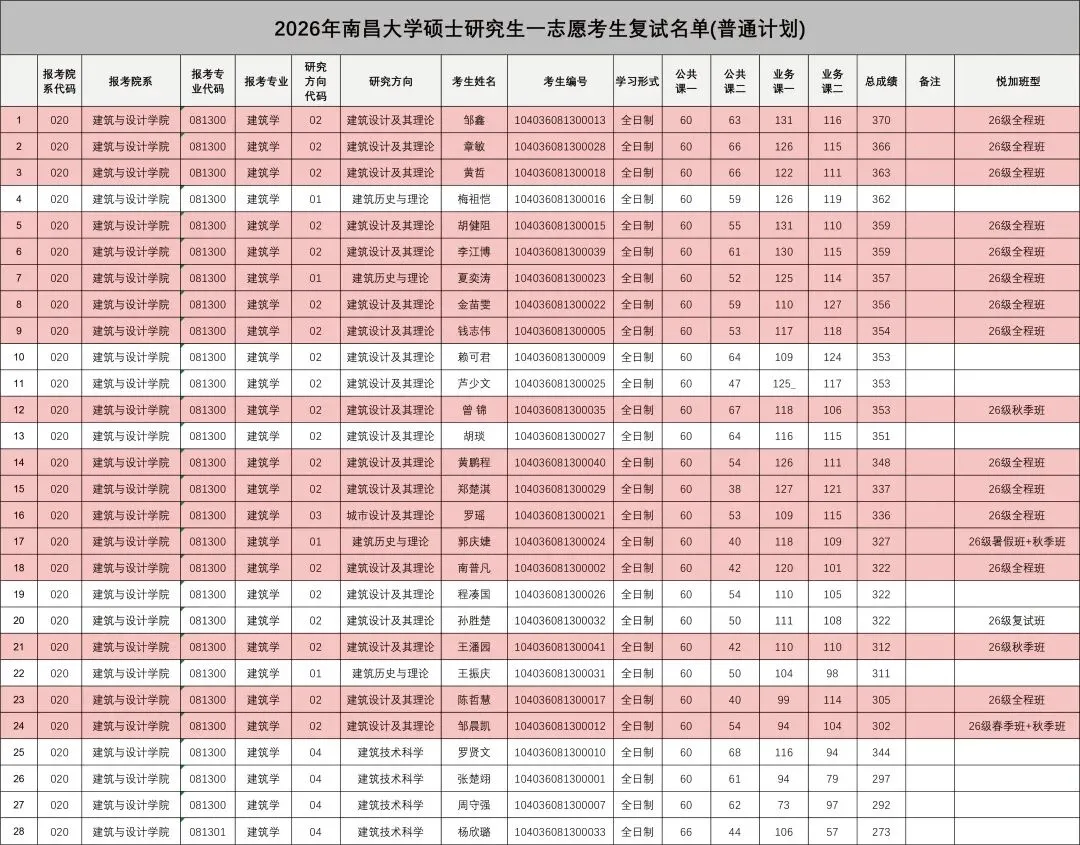 南昌大学建筑学04方向,总共进入复试4人;