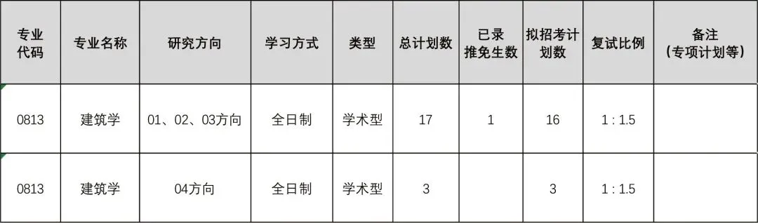 建筑学01、02、03方向,总计划招收17人,减去1位推免生,复试会刷掉8人。