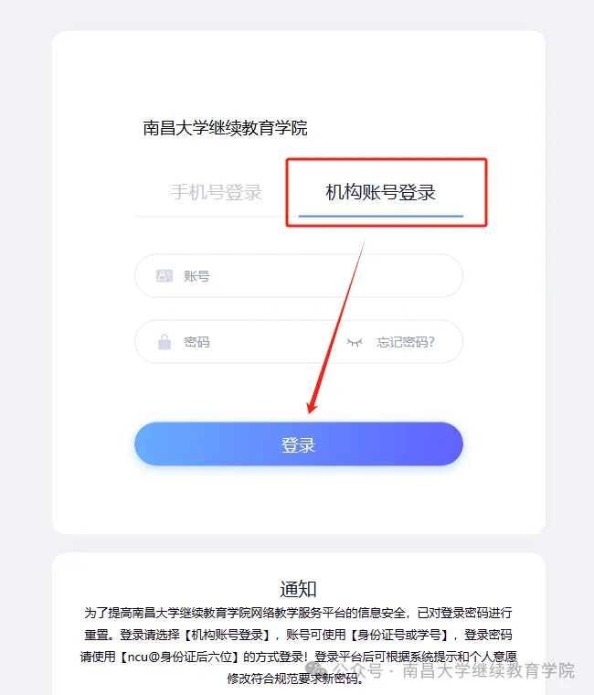 报名时间:2026年3月30日上午9:00—4月1日下午17:00,报名系统将于4月1日下午17:00关闭。报名网站“南昌大学继续教育学院”(http://sce1.sce.ncu.edu.cn/login),在登录页面选择【机构账号登录】,然后在此页面中输入账号、密码;账号为学习平台的账号密码,初始账号为【身份证号或学号】,初始密码为【ncu@身份证后六位】,如遇字母需大写。(如已修改密码请用修改后密码登录;如提示账号密码错误,之前已绑定手机号可以使用手机号修改密码或者联系自己教务老师进行重置密码)