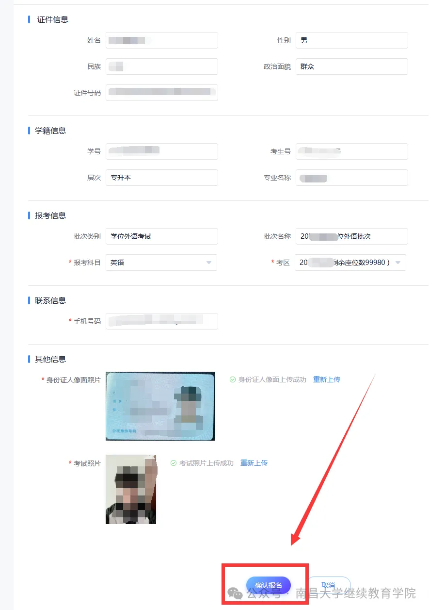 点击“报名”按钮,进入报名页面核对个人基本信息,证件、学籍信息会自动获取学习平台信息,输入手机号进行验证码验证后,在身份证人像面照片栏上传本人身份证人像面的照片,考试照片栏上传本人近期免冠电子照片。点击“确认报名”。