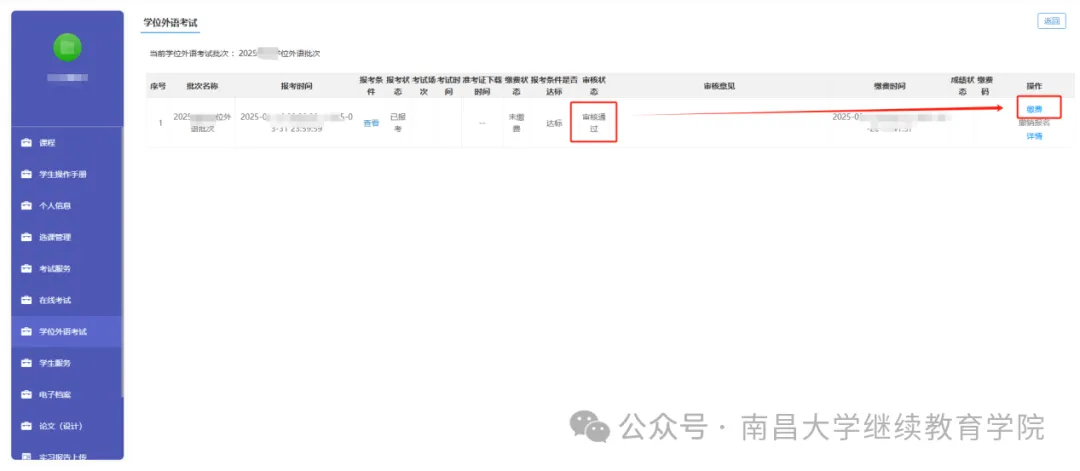 审核通过后在规定的缴费时间内点击“缴费”后会弹支付二维码,报名考试费在网上缴纳,收费标准按照江西省发展和改革委员会、江西省财政厅《关于对我省成人(自学考试)本科学生申请学士学位外语水平全省统一考试收费标准的函》(赣发改收费字[2013]384号)文件规定执行,每位考生收取报名考试费60元。凡逾期未缴费者,视为报考未成功。