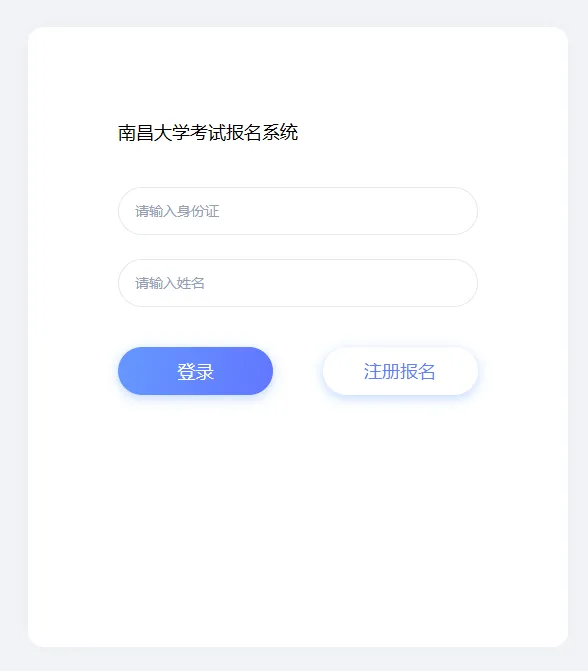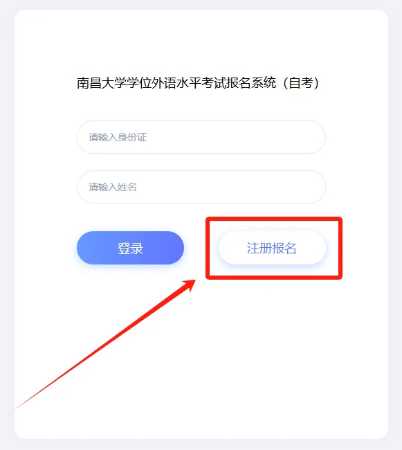 报名后可使用身份证号和姓名登录南昌大学学位外语水平考试报名系统(自考)http://sce1.sce.ncu.edu.cn/thesis-v2/xs/xwwyksbk/bkLogin