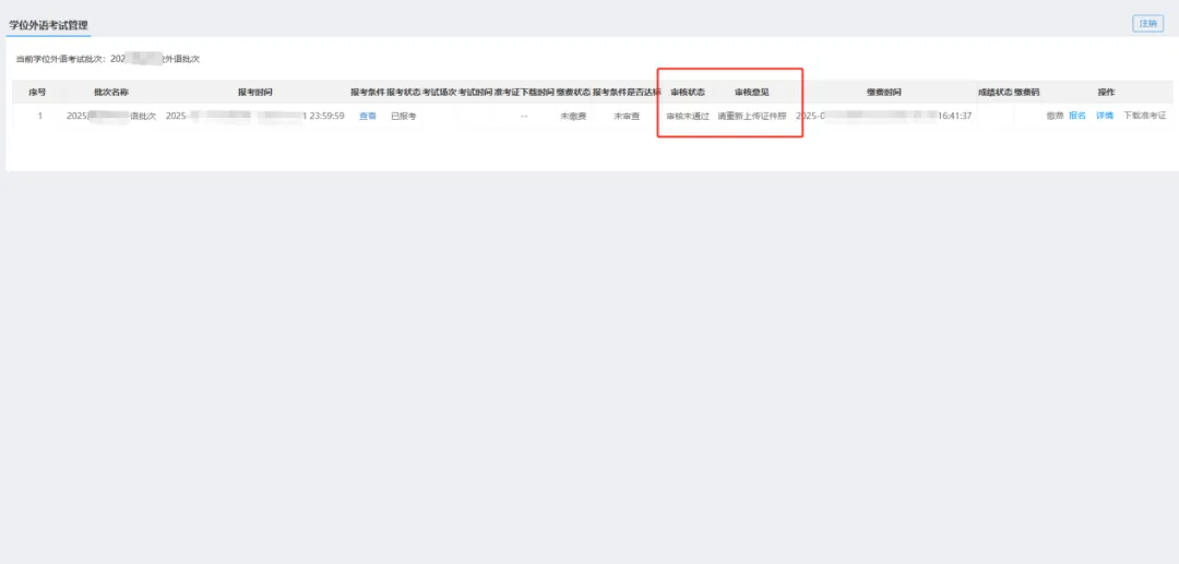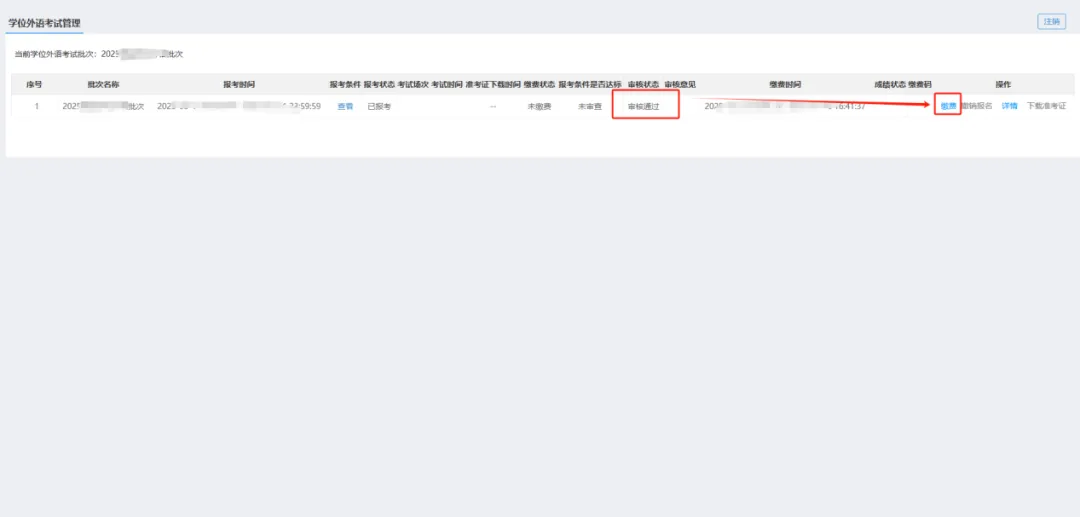 如审核状态变更为“审核通过”,则可点击右侧“缴费”按钮进行缴费。如审核状态为“审核未通过”,则按照审核意见重新提交报名,等待系统二次审核。