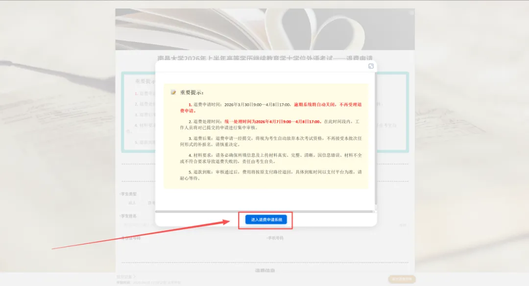 (1)阅读相关提示后点击“进入退费申请系统”