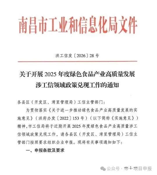 为贯彻落实《关于进一步推动绿色食品产业高质量发展的实施意见》(洪府办发〔2022〕153 号)(以下简称《实施意见》)精神,市工信局将于近期开展 2025 年度绿色食品产业高质量涉工信领域政策兑现工作,请各县区(开发区、湾里管理局)工信主管部门按照要求组织企业申报。现将有关事项通知如下: