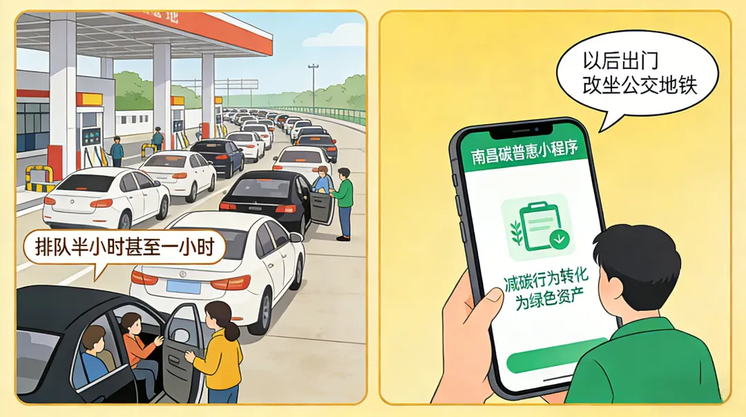 与其在加油站排队消耗时间,不如在绿色出行中积累财富。注册使用“南昌碳普惠”小程序,开通属于自己的个人“碳账户”。无论是通勤路上的一次地铁、公交扫码,还是逛便利店自备的一个环保布袋,你的每一次低碳选择,都在为城市减负,也在为自己“增值”。