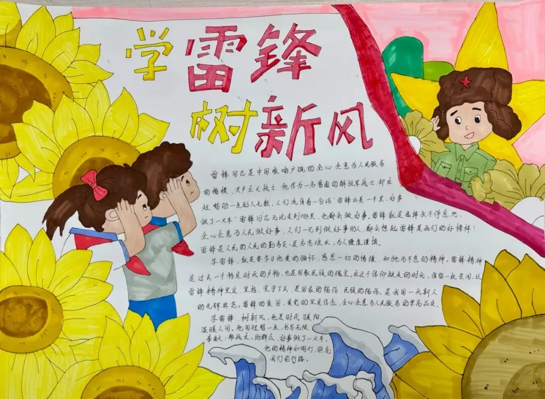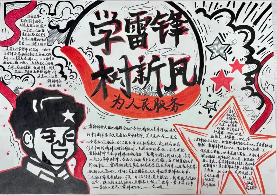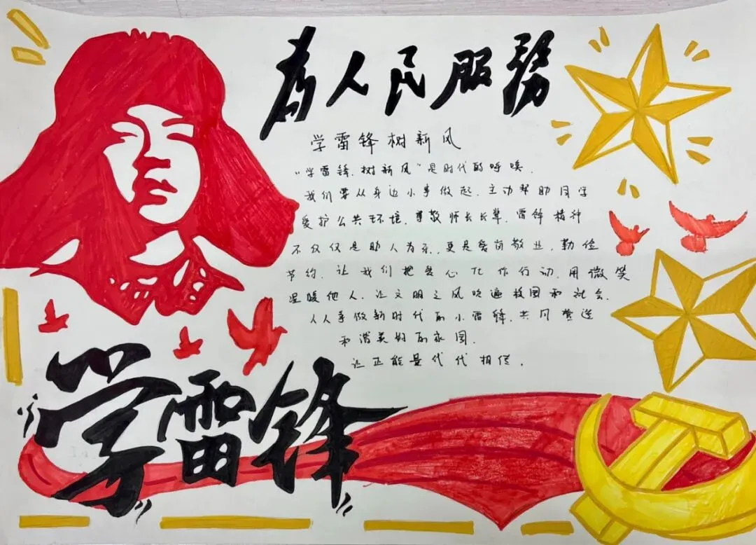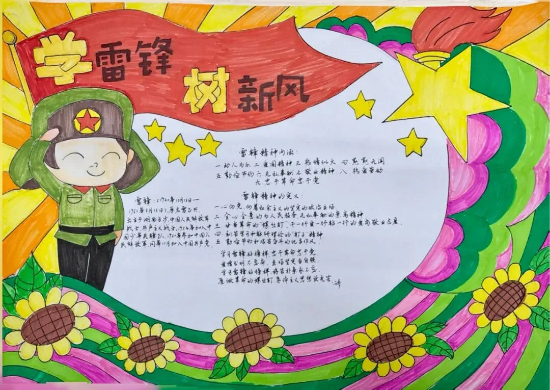 为丰富学雷锋活动的形式,激发学生的创造力与参与热情,我校还组织全年级各班级开展了以“学雷锋,树新风”为主题的手抄报绘制活动。同学们利用课余时间,精心构思、用心绘制,用五彩的画笔和真挚的文字,表达对雷锋同志的敬仰之情。