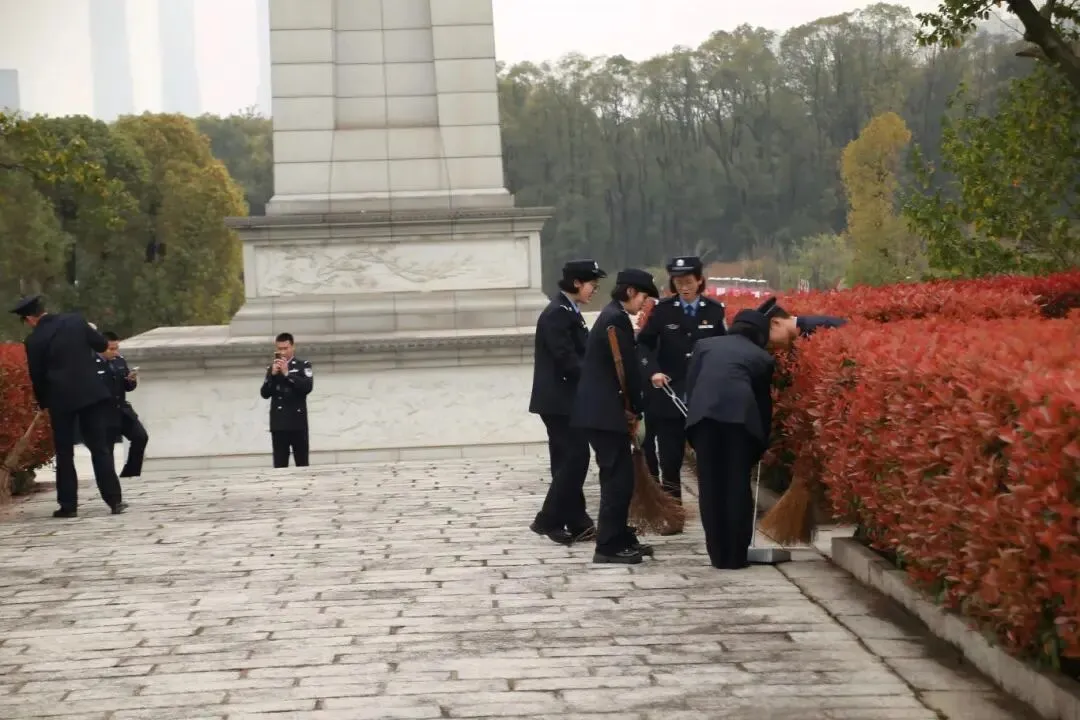 朗诵结束后,队员们迅速分工协作,手持清洁工具,认真投入到陵园清扫工作中。大家细致清理园区内的杂物,擦拭纪念设施,不放过任何一处卫生死角,以朴实的行动守护陵园的整洁肃穆,在实干中践行雷锋精神。