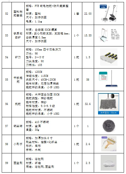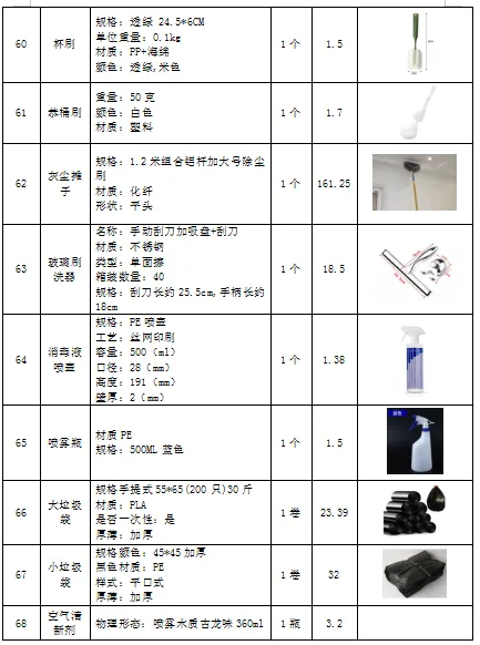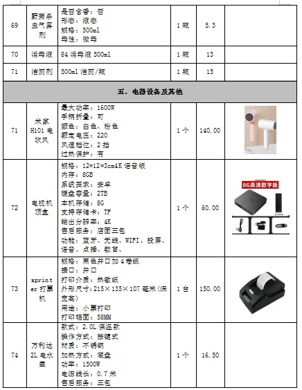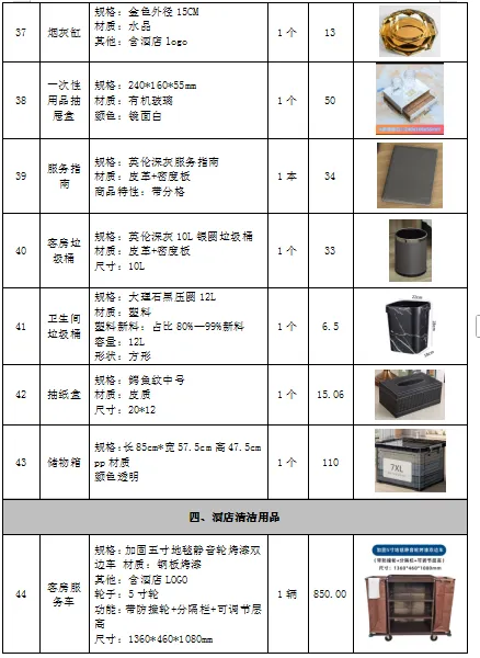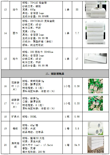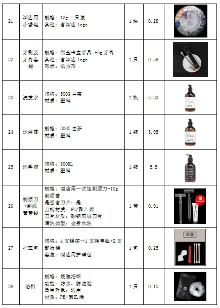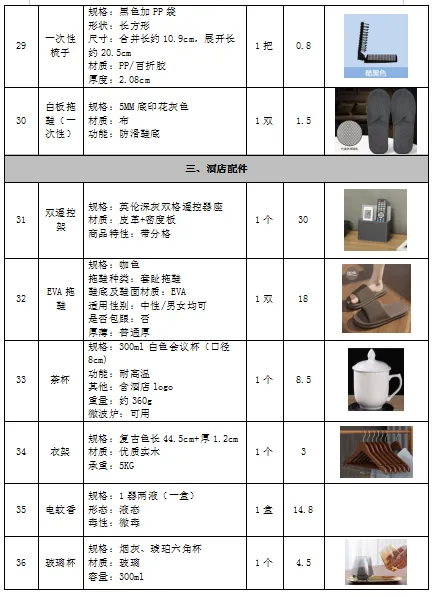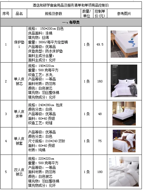 (一)商品清单及单项控制价:详见下表《酒店和研学宿舍用品及服务清单和单项商品控制价》,内容包括布草类、酒店消耗品、酒店配件、清洁用品、电器设备及其他等。