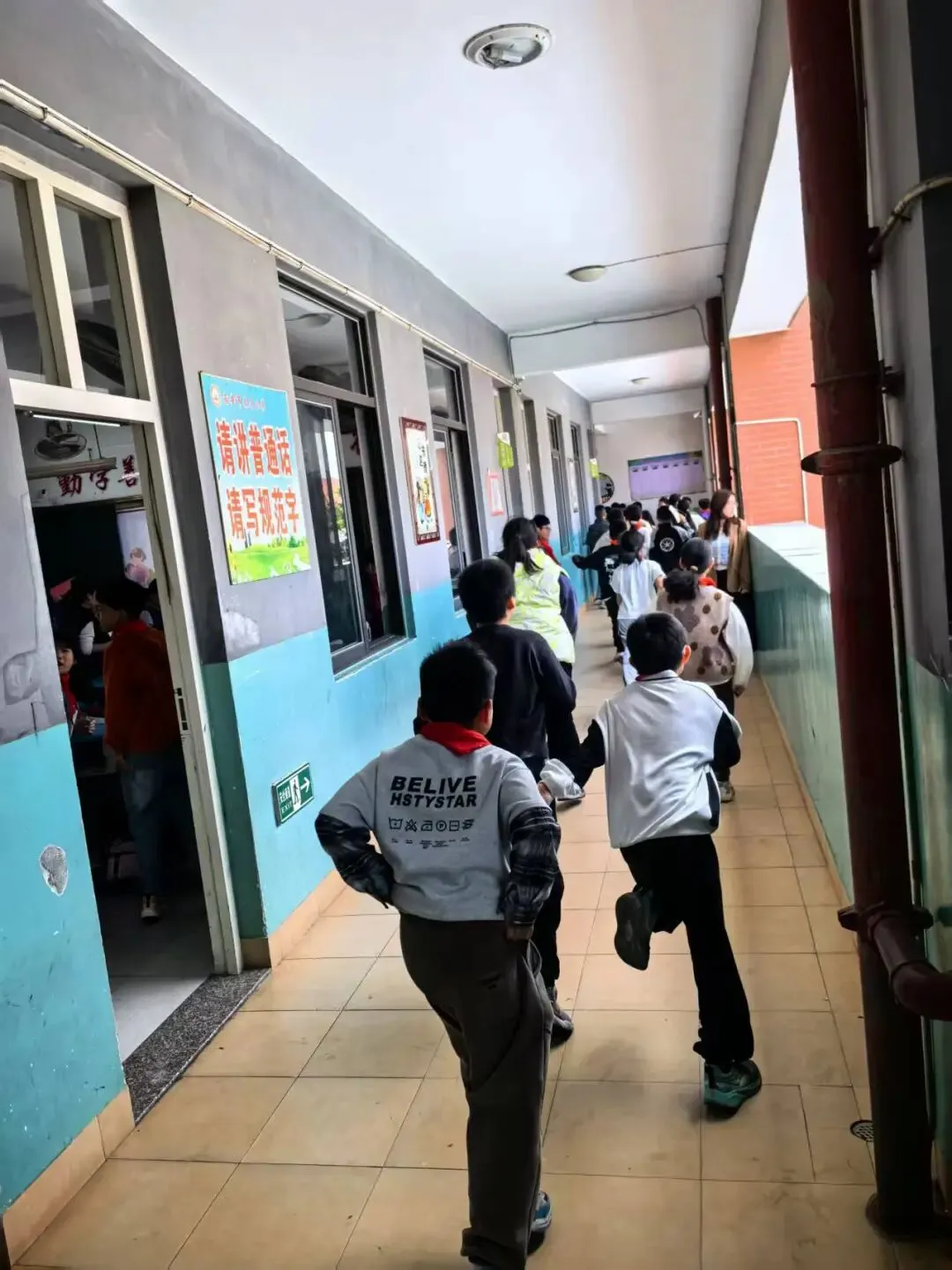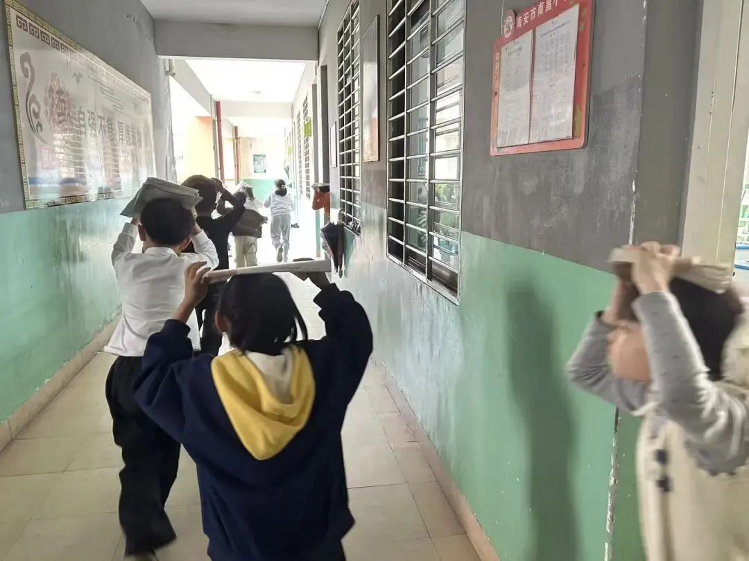 在地震应急疏散演练中,随着警报响起,同学们迅速抱头躲避,随后在班主任有序引导下,弯腰护头、快速有序撤离至操场安全地带,全程紧张有序、规范高效。