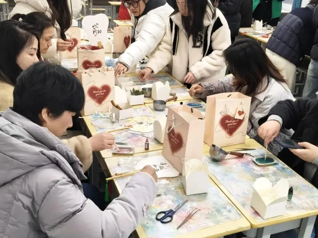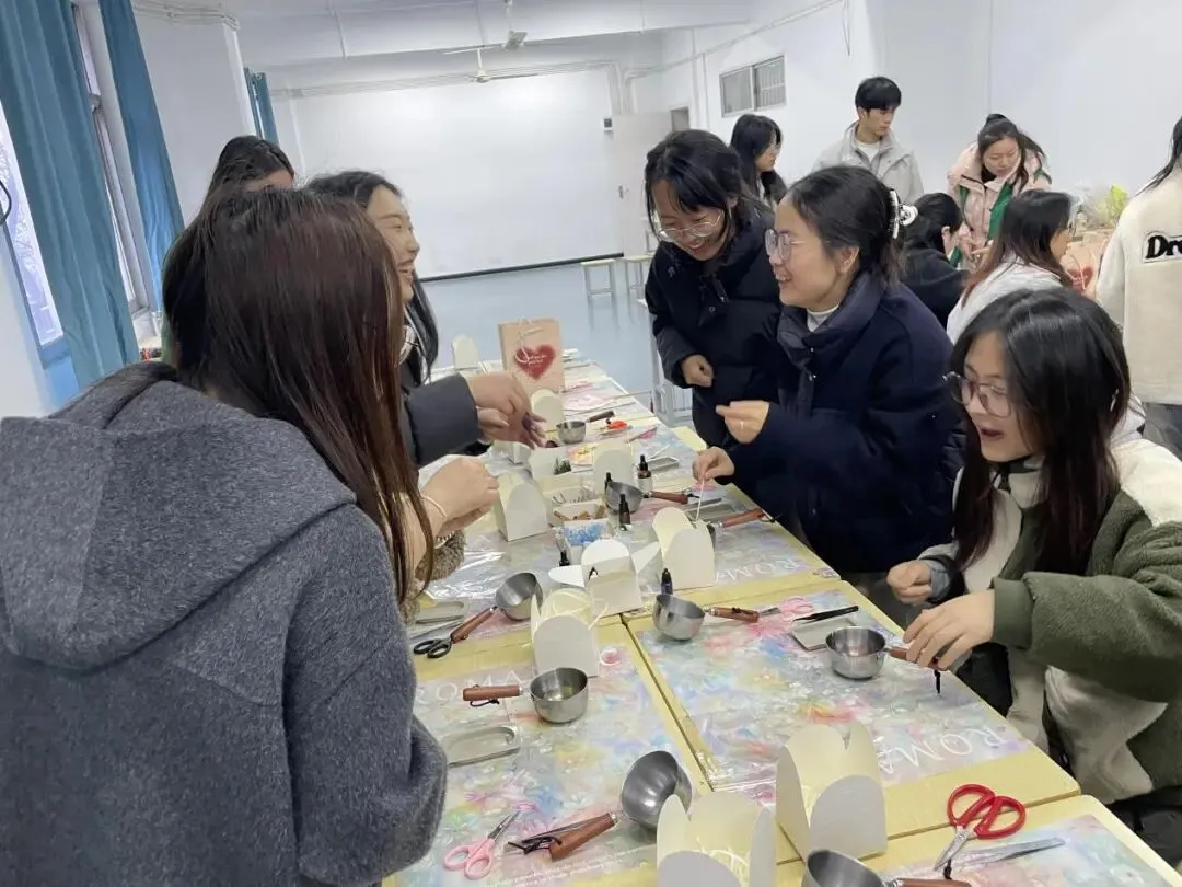 因交通不便,东湖校区的三八女神节活动由医学技术系精心组织开展,设置香薰蜡片、飘漆团扇两大特色手工环节,为校区女职工带来文艺满满的节日体验。香薰蜡片制作区,女职工们自由挑选干花、精油与模具,在指导下制作出兼具颜值与香气的专属蜡片;飘漆团扇环节,大家在专业讲解下学习调漆、晕染技巧,将色彩斑斓的漆纹定格在扇面,制作出独具国风韵味的团扇,现场处处洋溢着创作的乐趣与节日喜悦。