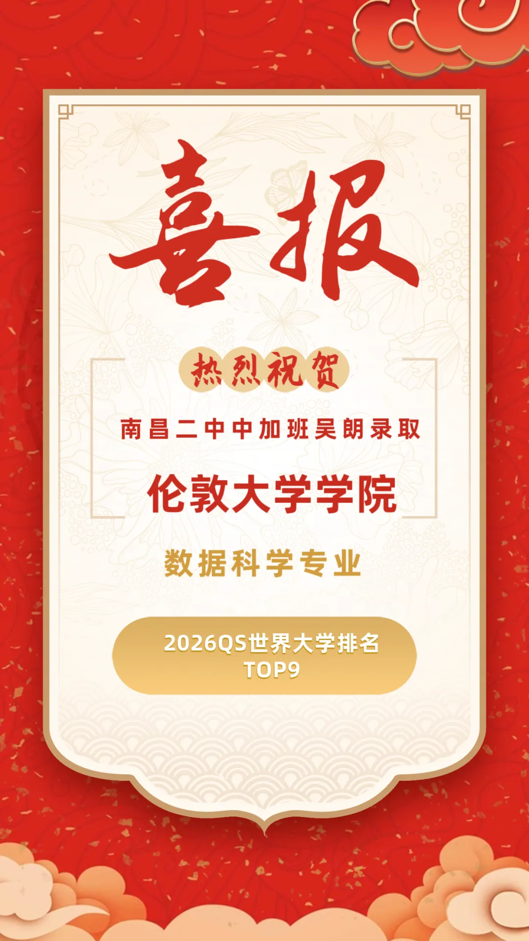 南昌二中国际部高三学子申请季好消息源源不断!继此前世界前20、前30、前50大学offer尽收囊中,本周又有吴朗同学斩获英国G5超级精英大学伦敦大学学院offer。本届高三已有多位同学接到世界前10顶尖名校录取!