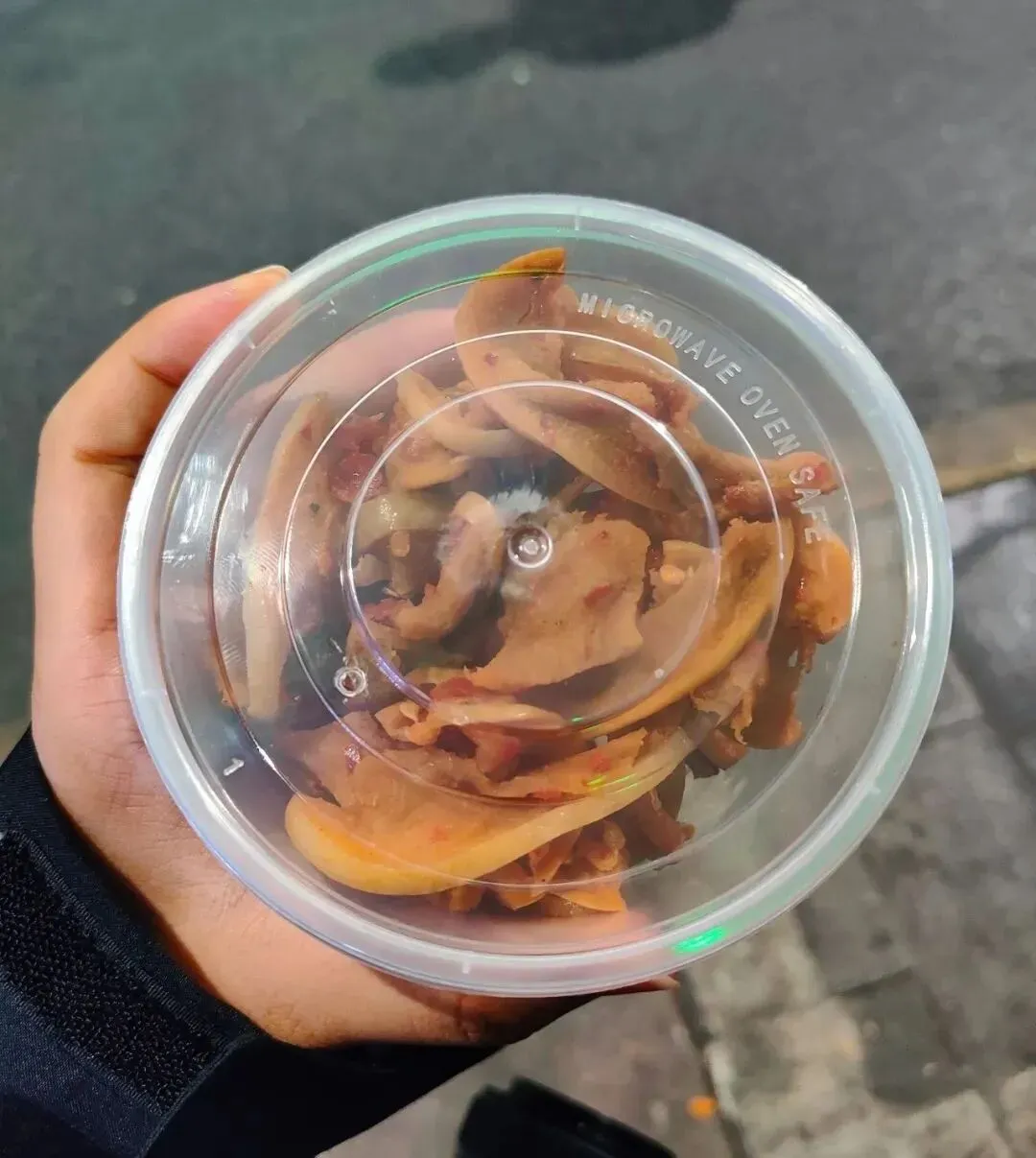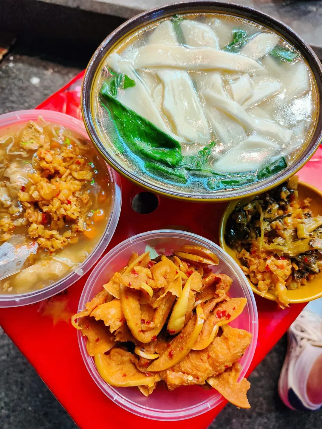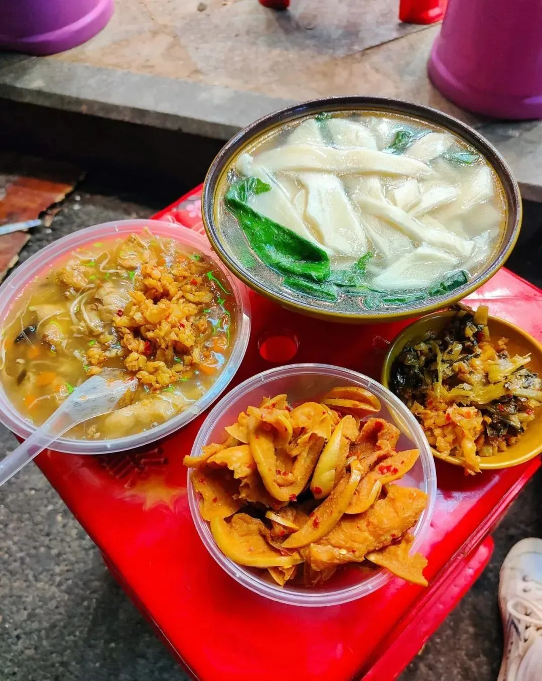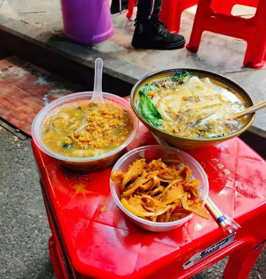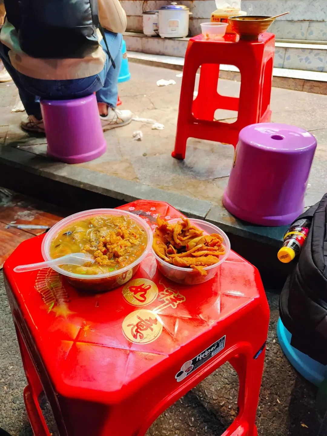 这个环境很路边摊很有年代感了哈哈哈哈,没有桌椅,就在街边,一摞大小凳子自己拿,以大凳子为桌小凳子为椅,话说小凳子好像倒扣的垃圾桶(不是。很久没这样吃了,很有意思。