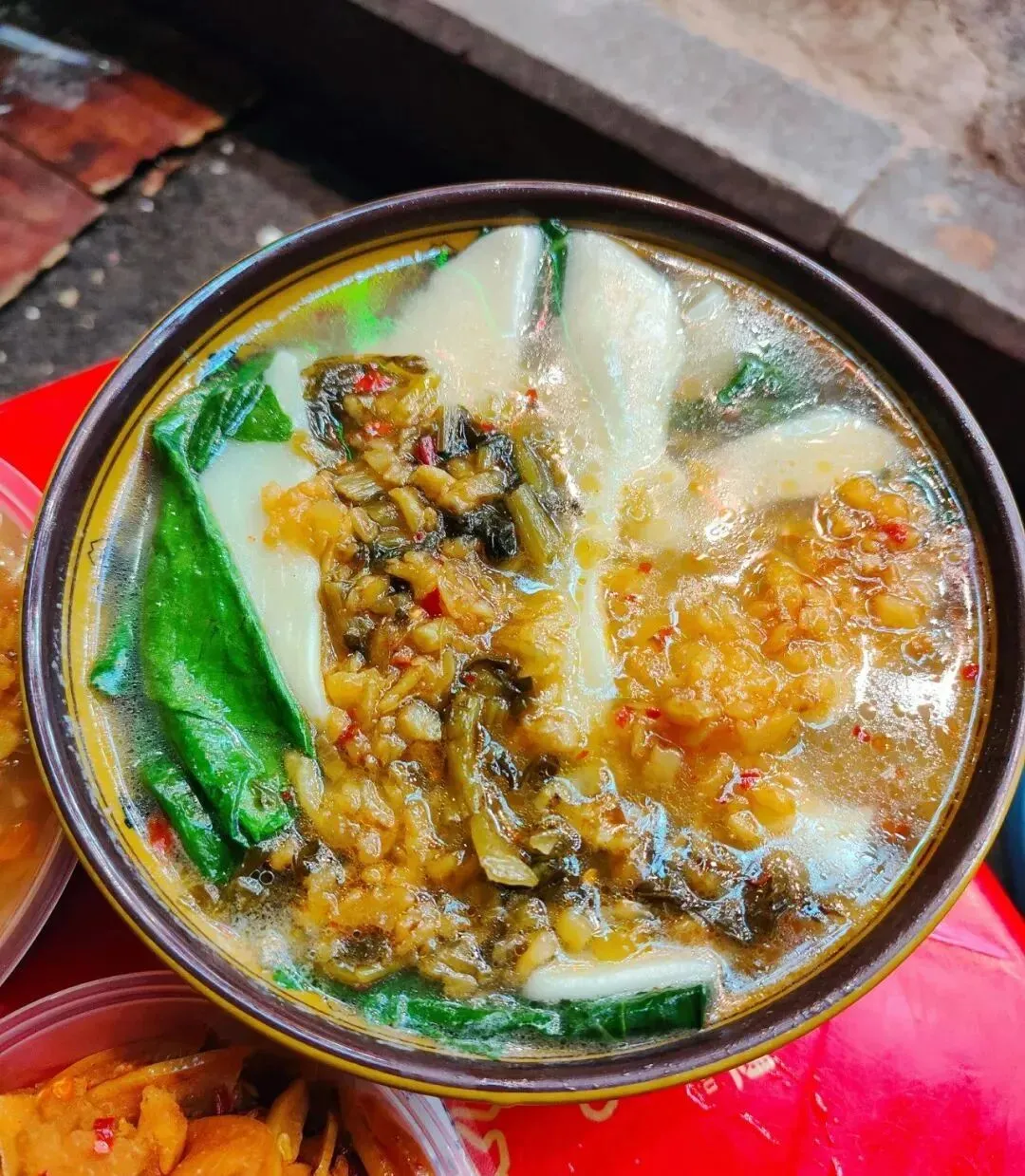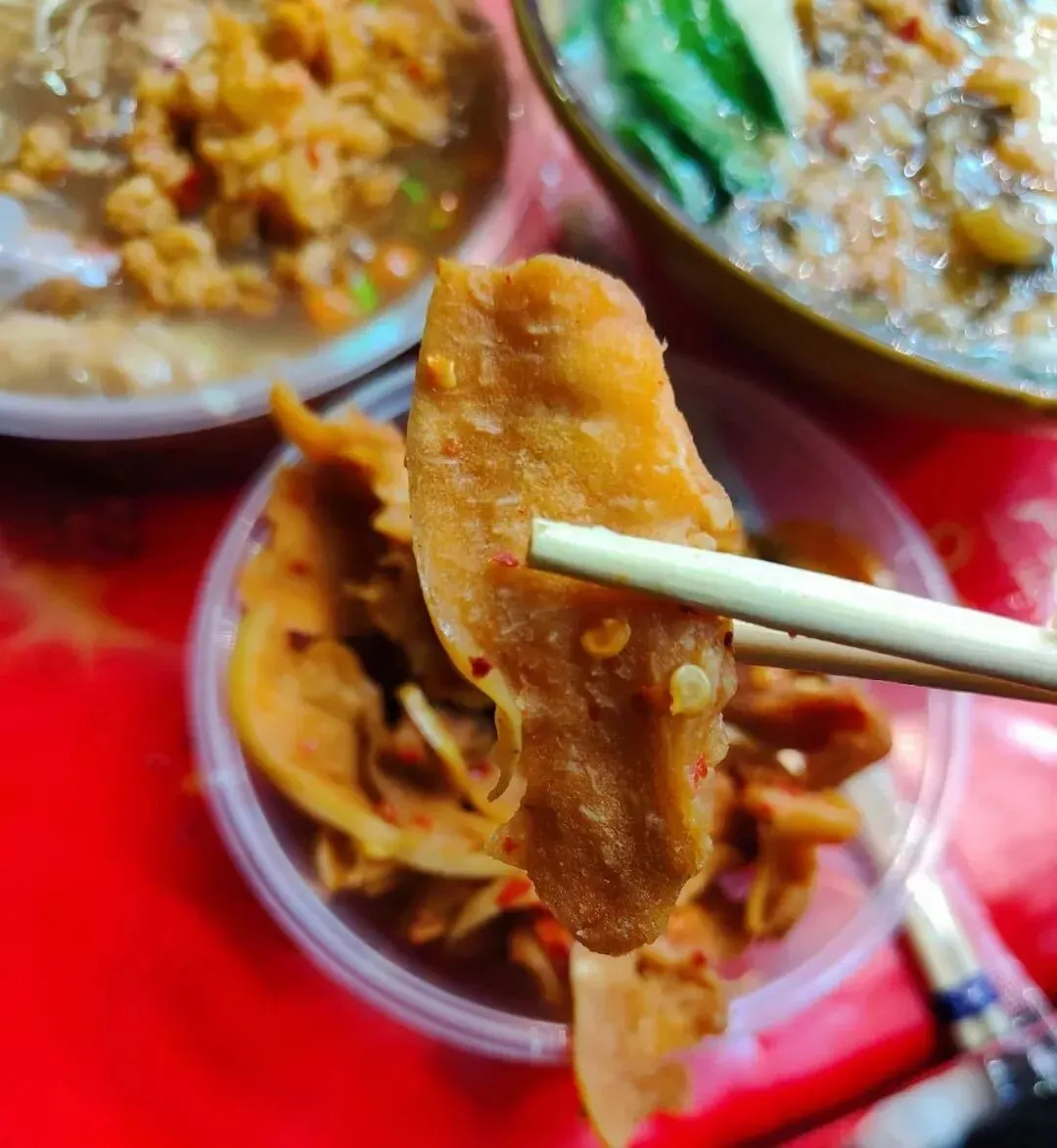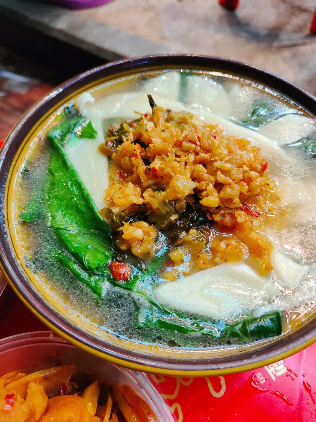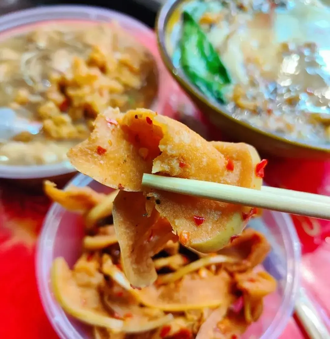 分了点小菜掺进去,有点像台州的糟羹和天台的玉米糊和河南的胡辣汤哈哈哈哈,就是那一个类别的,糊糊冻冻,极为浓稠。里面小料可丰富啦,一碗基本满满都是料,胡萝卜、金针菇、豆泡、黑木耳、香菇、腐竹、豆皮等。