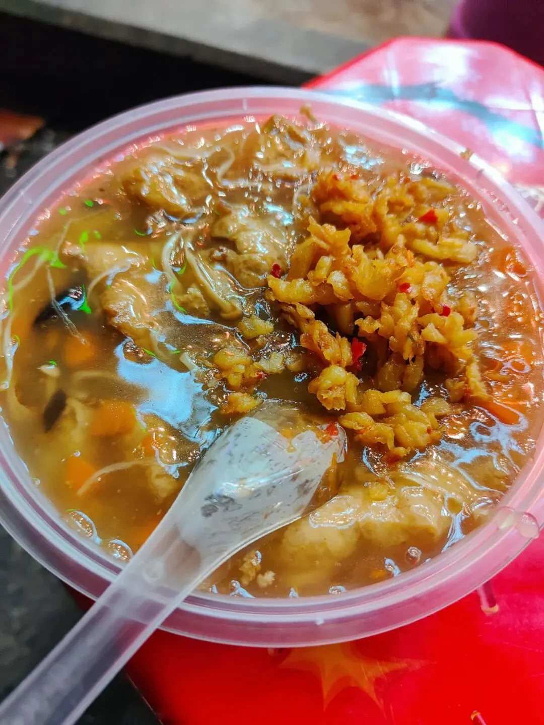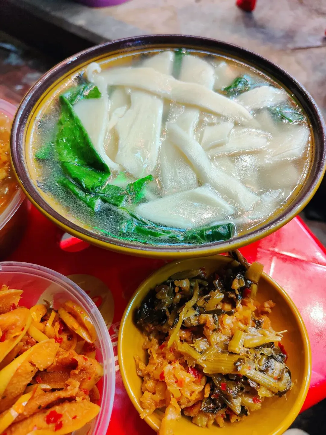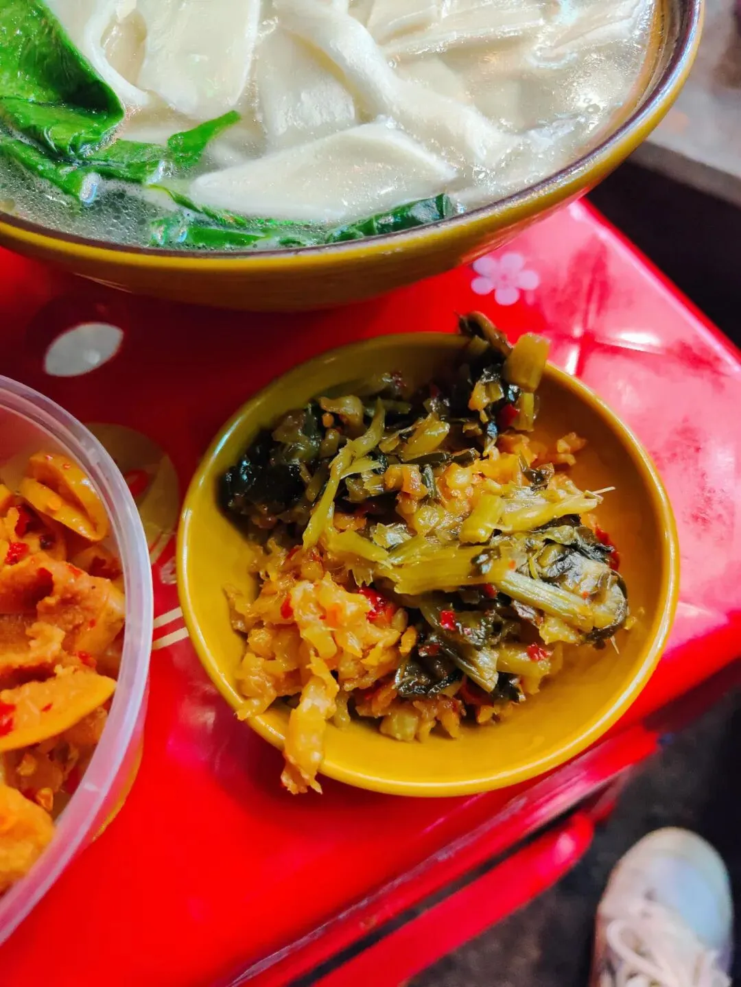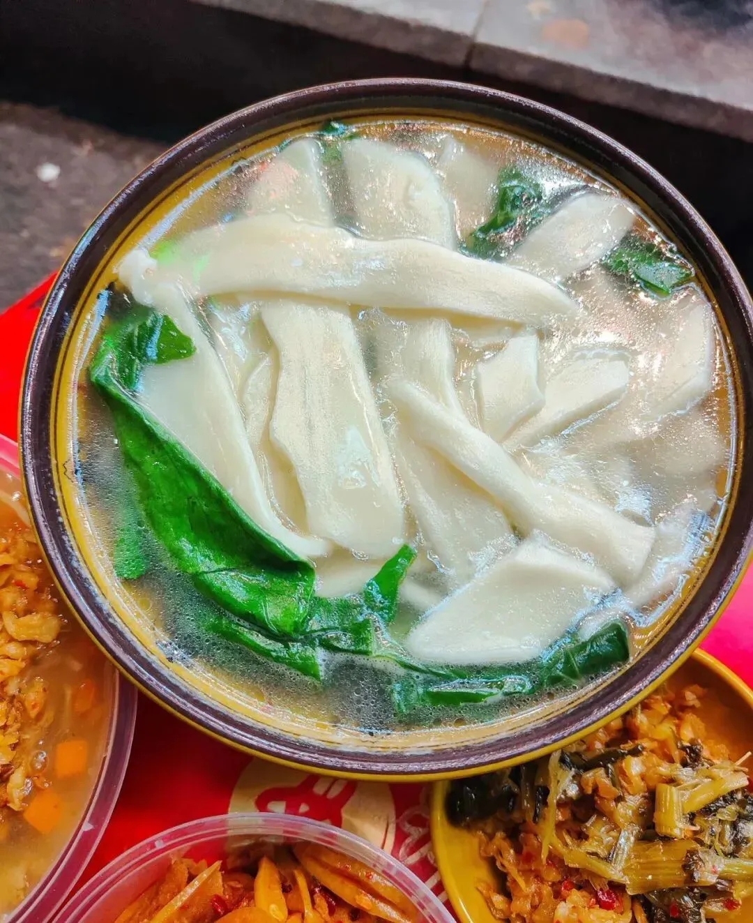 分了点小菜掺进去,有点像台州的糟羹和天台的玉米糊和河南的胡辣汤哈哈哈哈,就是那一个类别的,糊糊冻冻,极为浓稠。里面小料可丰富啦,一碗基本满满都是料,胡萝卜、金针菇、豆泡、黑木耳、香菇、腐竹、豆皮等。