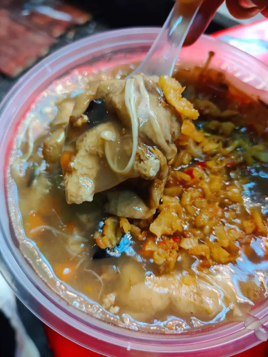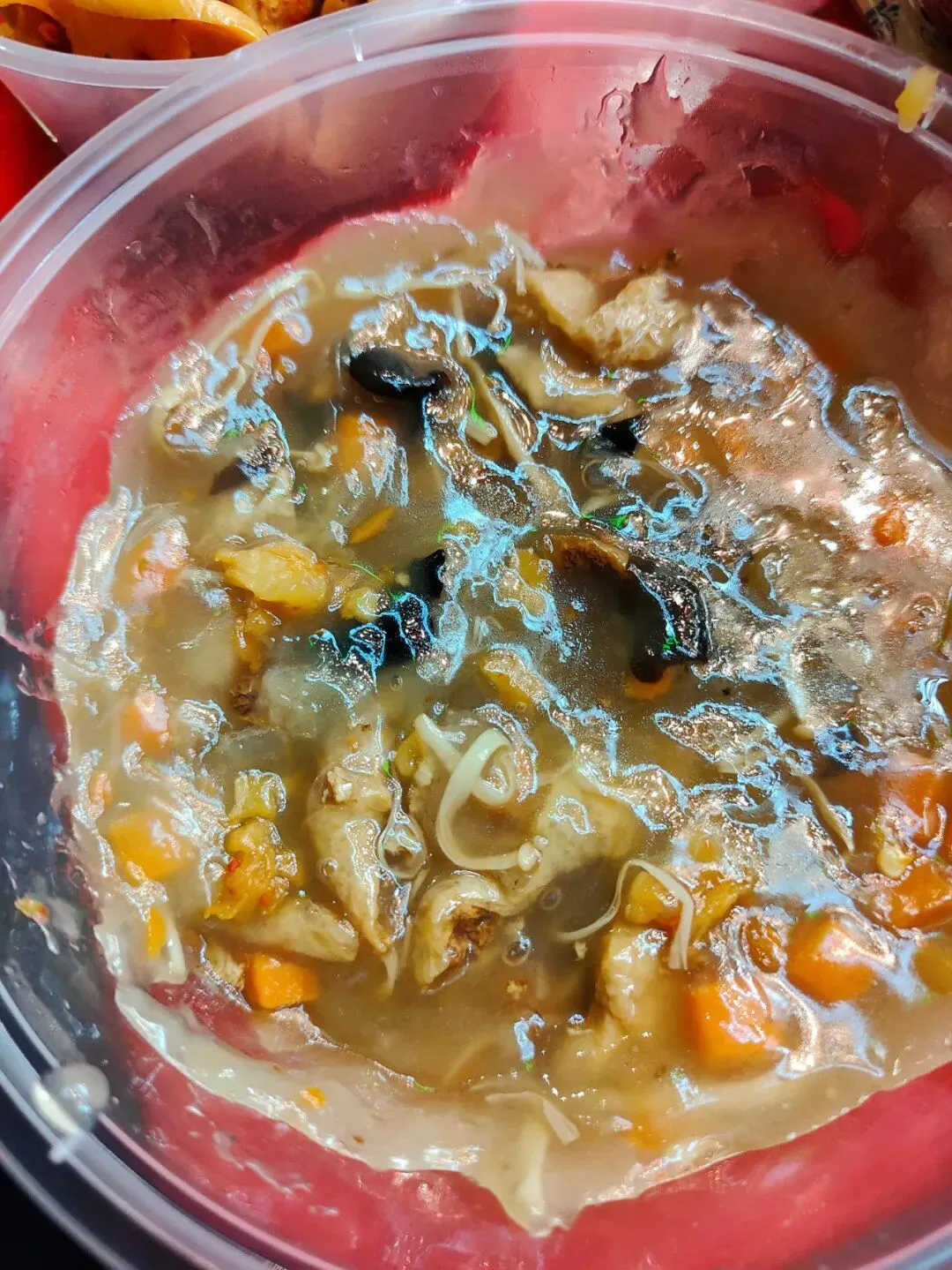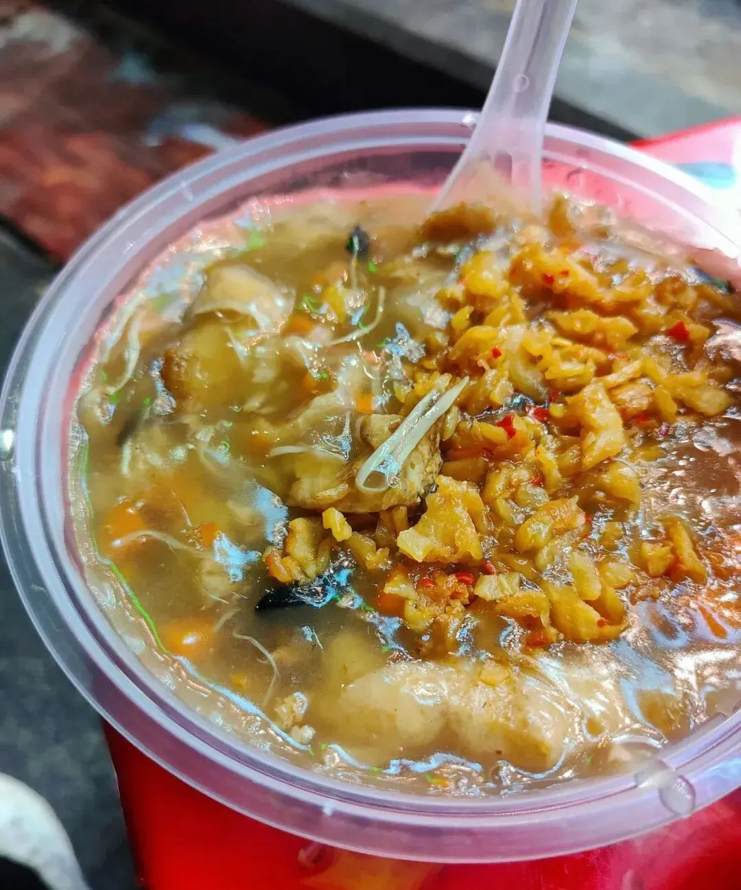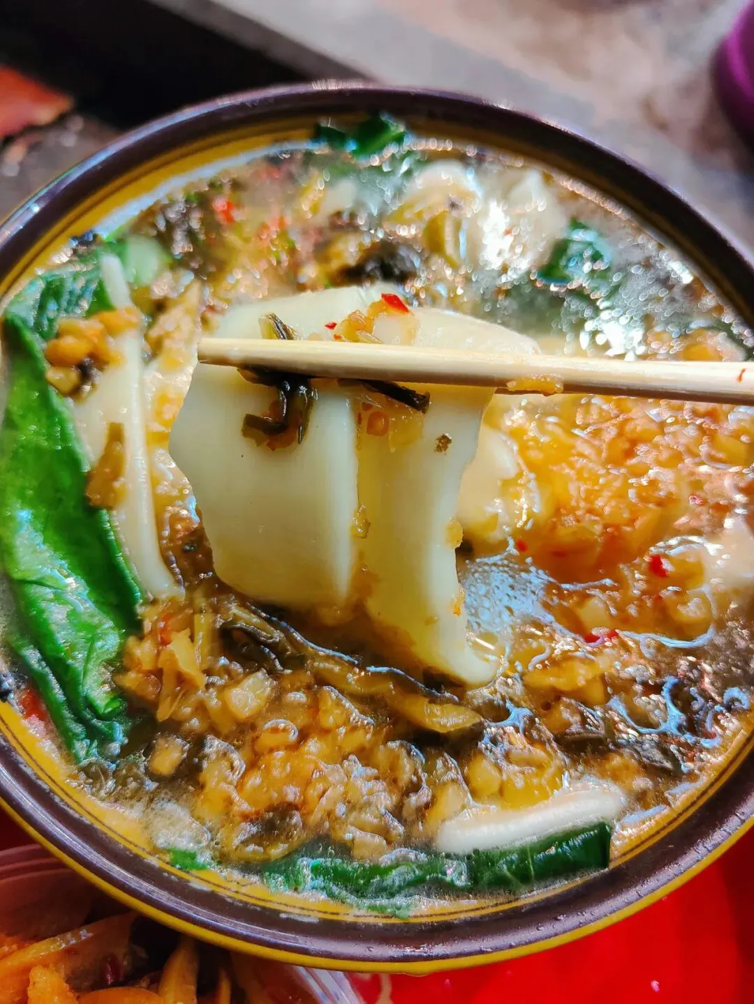 分了点小菜掺进去,有点像台州的糟羹和天台的玉米糊和河南的胡辣汤哈哈哈哈,就是那一个类别的,糊糊冻冻,极为浓稠。里面小料可丰富啦,一碗基本满满都是料,胡萝卜、金针菇、豆泡、黑木耳、香菇、腐竹、豆皮等。