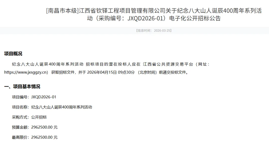 3 月 25 日,官方发布了纪念八大山人诞辰 400 周年系列活动电子化公开招标公告(采购编号:JXQD2026-01)。根据公告显示,本次系列活动总预算金额高达 2962500 元,计划于 2026 年 7 月至 10 月期间举办,是一场集学术交流、文物特展、公共教育、宣传推广于一体的高规格文化活动,旨在传承弘扬八大山人艺术精神,擦亮南昌本土文化金名片。八大山人是中国艺术史上的殿堂级书画大师,是东方文人画的巅峰代表,更是南昌享誉世界的核心文化符号。知名文化学者余秋雨曾盛赞八大山人,称其笔墨风骨凝练了中国传统艺术的精神内核,是足以比肩世界艺术大师的东方巨匠。本次活动围绕八大山人艺术文化核心打造,活动内容丰富,亮点诸多: