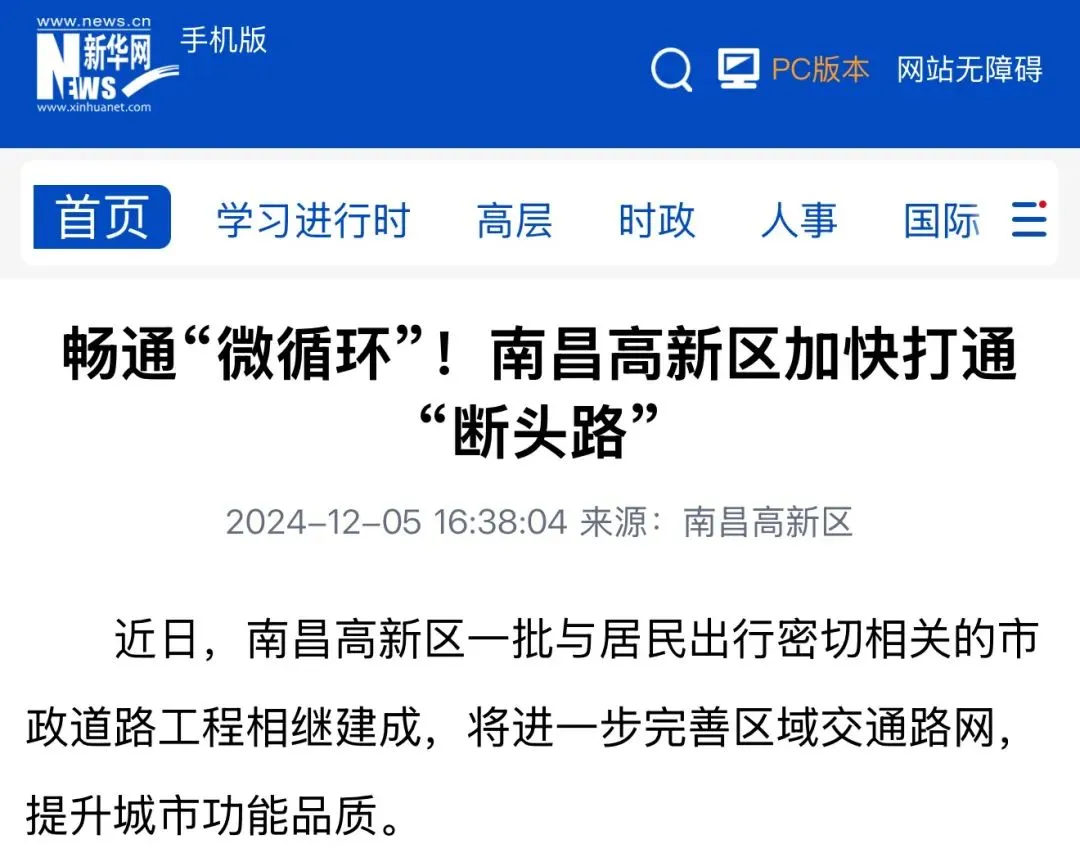 近日,南昌高新区一批与居民出行密切相关的市政道路工程相继建成,将进一步完善区域交通路网,提升城市功能品质。《新华网》同步聚焦报道。