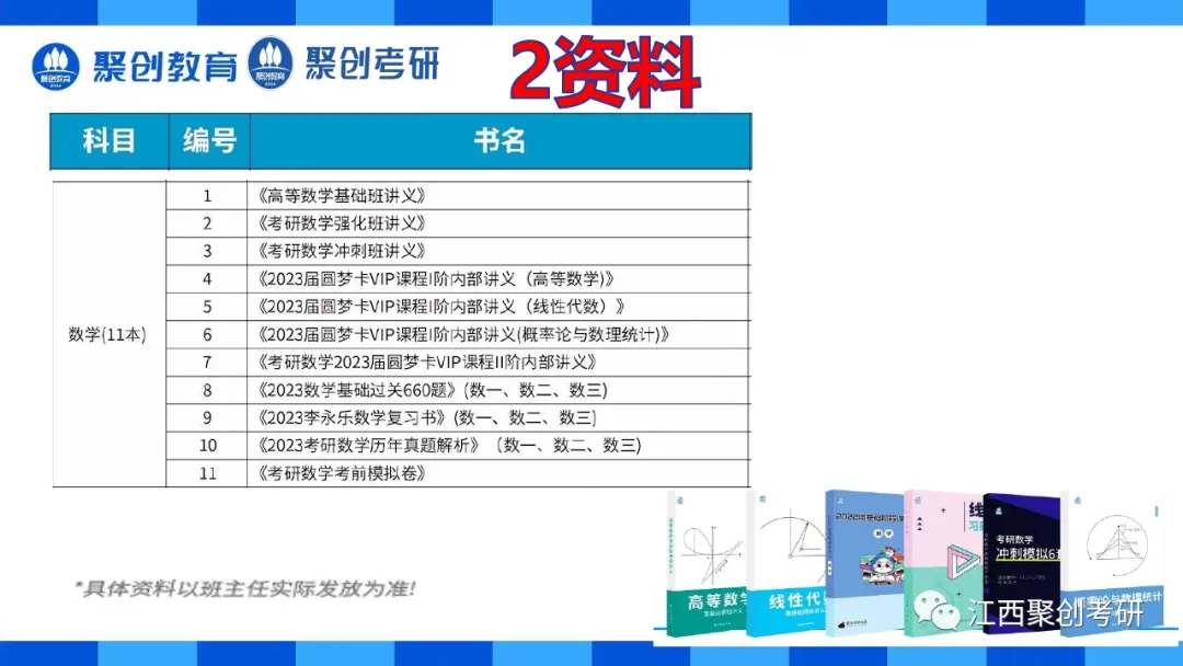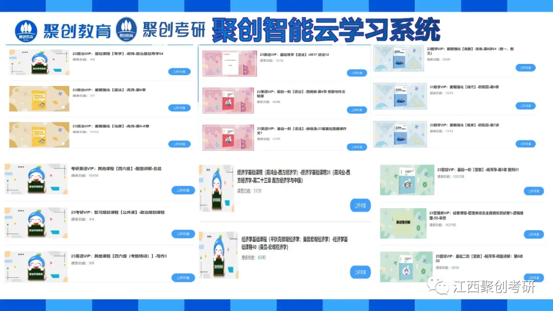 选择好的辅导资料等于考研迈出了一大步。我们会为江西聚创考研全日制二战集训营学员提供公共课和专业课资料。