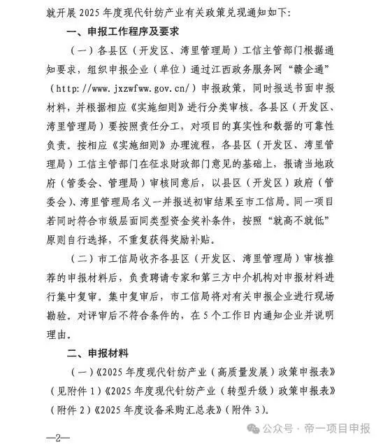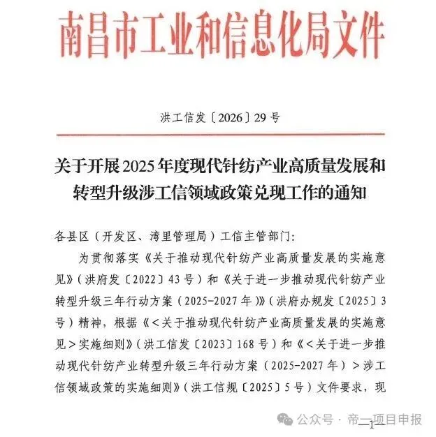 为贯彻落实《关于推动现代针纺产业高质量发展的实施意见》(洪府发〔2022〕43号)和《关于进一步推动现代针纺产业转型升级三年行动方案(2025-2027年)》(洪府办规发〔2025〕3号)精神,根据《<关于推动现代针纺产业高质量发展的实施意见>实施细则》(洪工信发〔2023〕168号)和《<关于进一步推动现代针纺产业转型升级三年行动方案(2025-2027年)>涉工信领域政策的实施细则》(洪工信规〔2025〕5号)文件要求,现就开展2025年度现代针纺产业有关政策兑现通知如下: