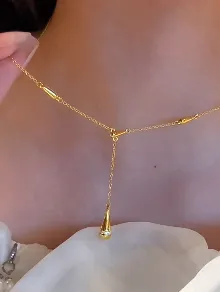 项链我就是走那种锁骨链路线 细细一条 足金的 小小的圆牌吊坠 颜色比18K那种更黄一点 但是戴在锁骨上的时候 氛围感真的绝了 我结婚那天是大V领裙子 这条刚好卡在锁骨那一条线 拍照出来修饰脖子和锁骨的效果特别好 然后平时我会叠戴一条更细的18K金小链子 整个就很有层次感 又不会很用力地凹造型 那种effortless的高级感就出来了