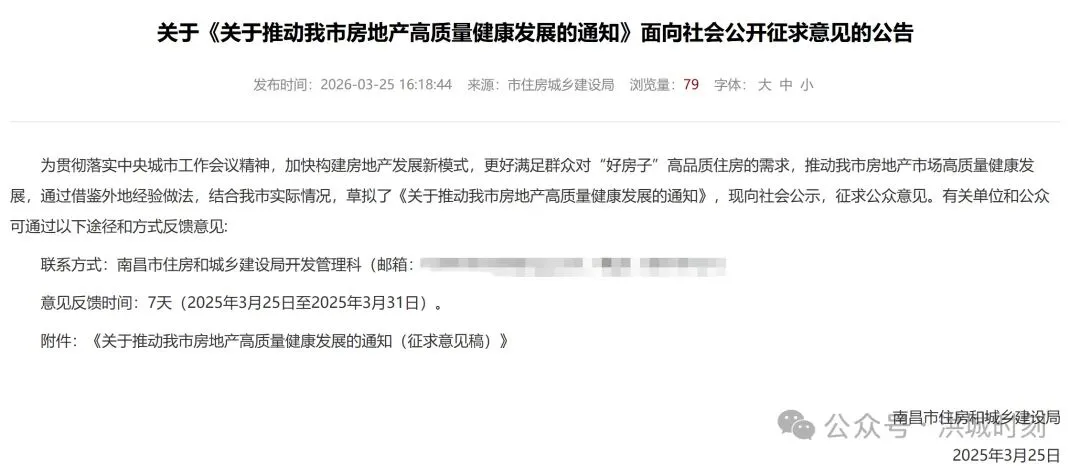 昨天(3月25日),南昌发布《关于推动我市房地产高质量健康发展的通知(公示稿)》,聚焦高品质住宅建设、住房消费提振、房企纾困三大维度,推出一系列务实新政,精准惠及购房者与房地产开发企业,助力楼市高质量健康发展。