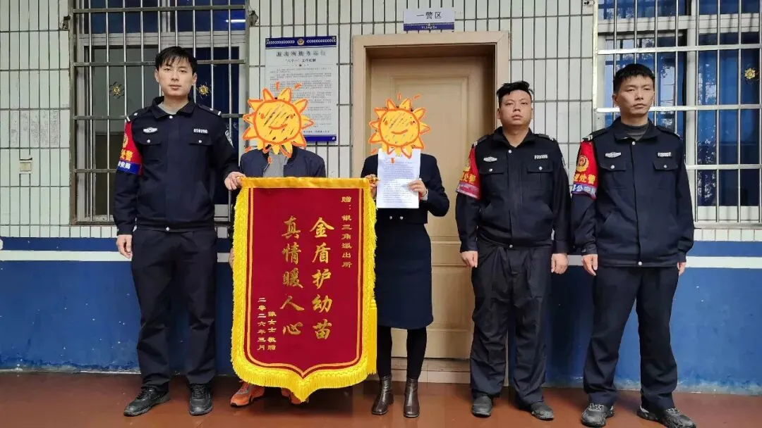 锦旗上写着“金盾护幼苗 真情暖人心”