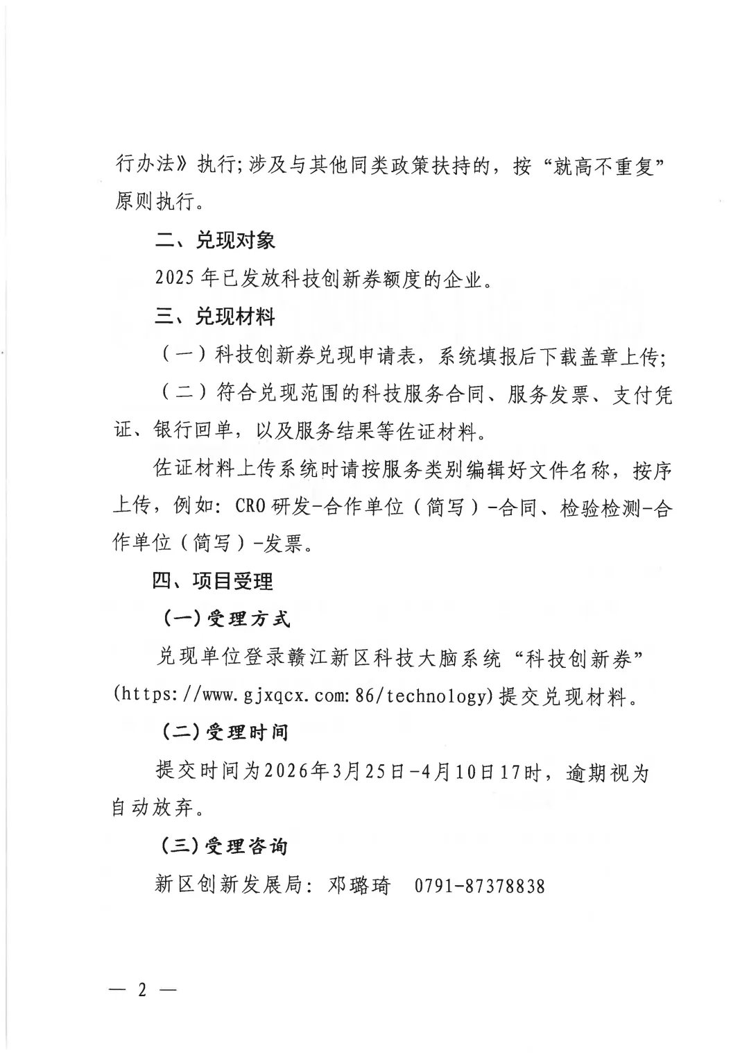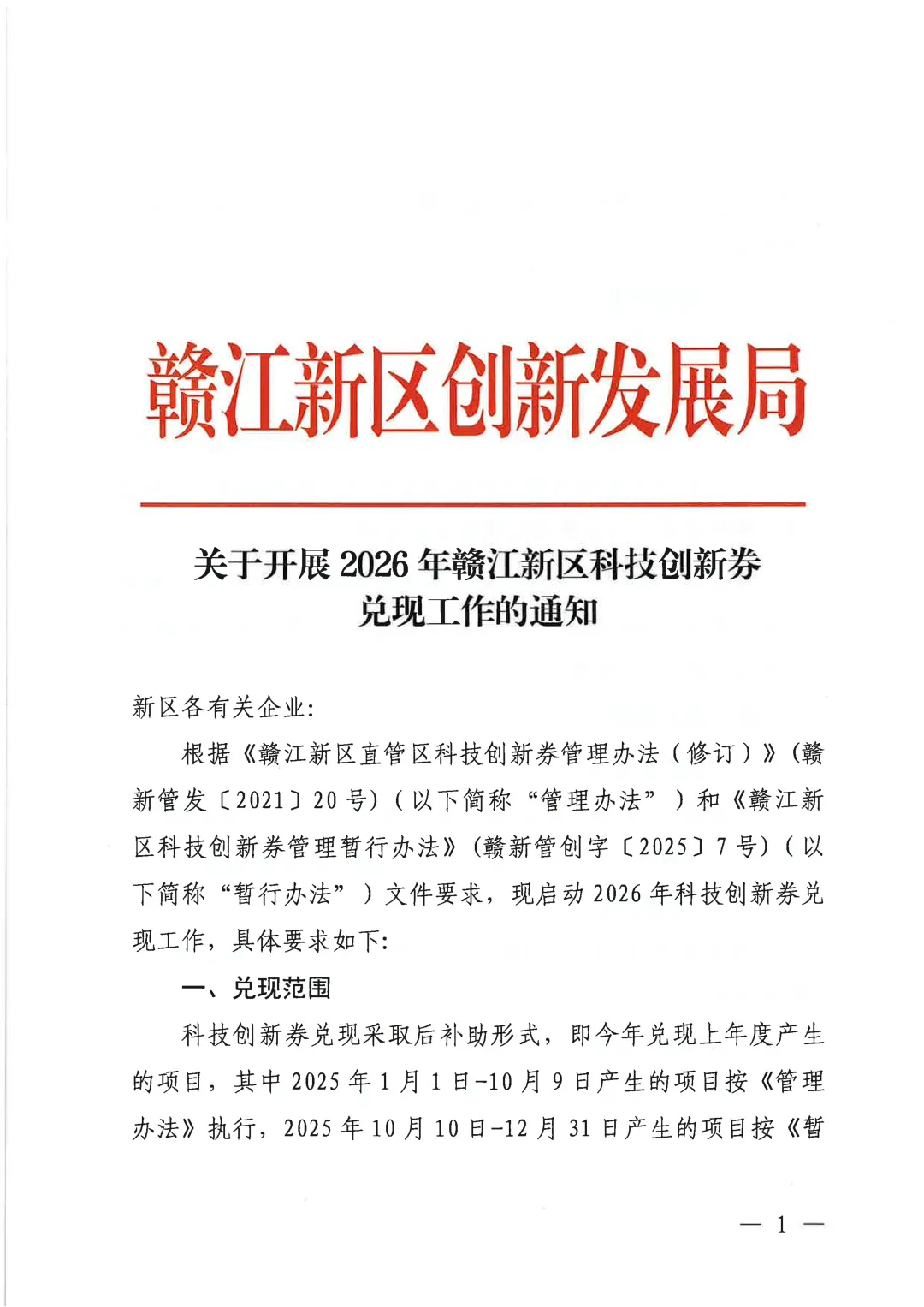 关于开展2026年赣江新区科技创新券兑现工作的通知