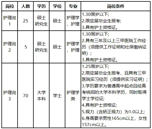 (三)岗位条件1.条件栏中的年龄30周岁以下,要求1995年3月1日以后出生;年龄25周岁以下,要求2000年3月1日以后出生。2.2026年应届毕业生,须于2026年8月31日前取得相应毕业证书、学位证书及护士资格证。3.本次招聘中,护理岗1、护理岗2录用人员实行院内人事代理聘用,护理岗3录用人员实行编外聘用,依照国家有关规定实行试用期考核。试用期满考核不合格的,按有关规定予以解聘。