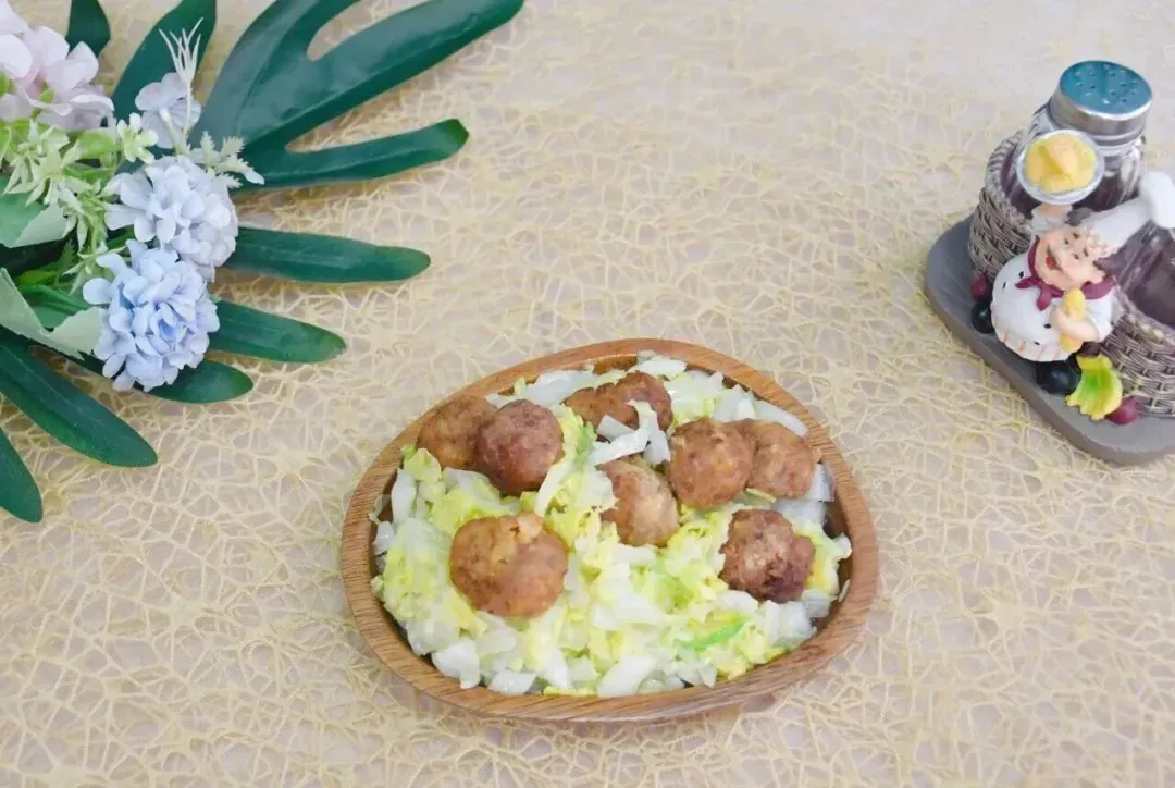西兰花鸡蛋炒白玉菇、黄芽白烧肉丸、山药枸杞肉末汤、黑芝麻香米饭