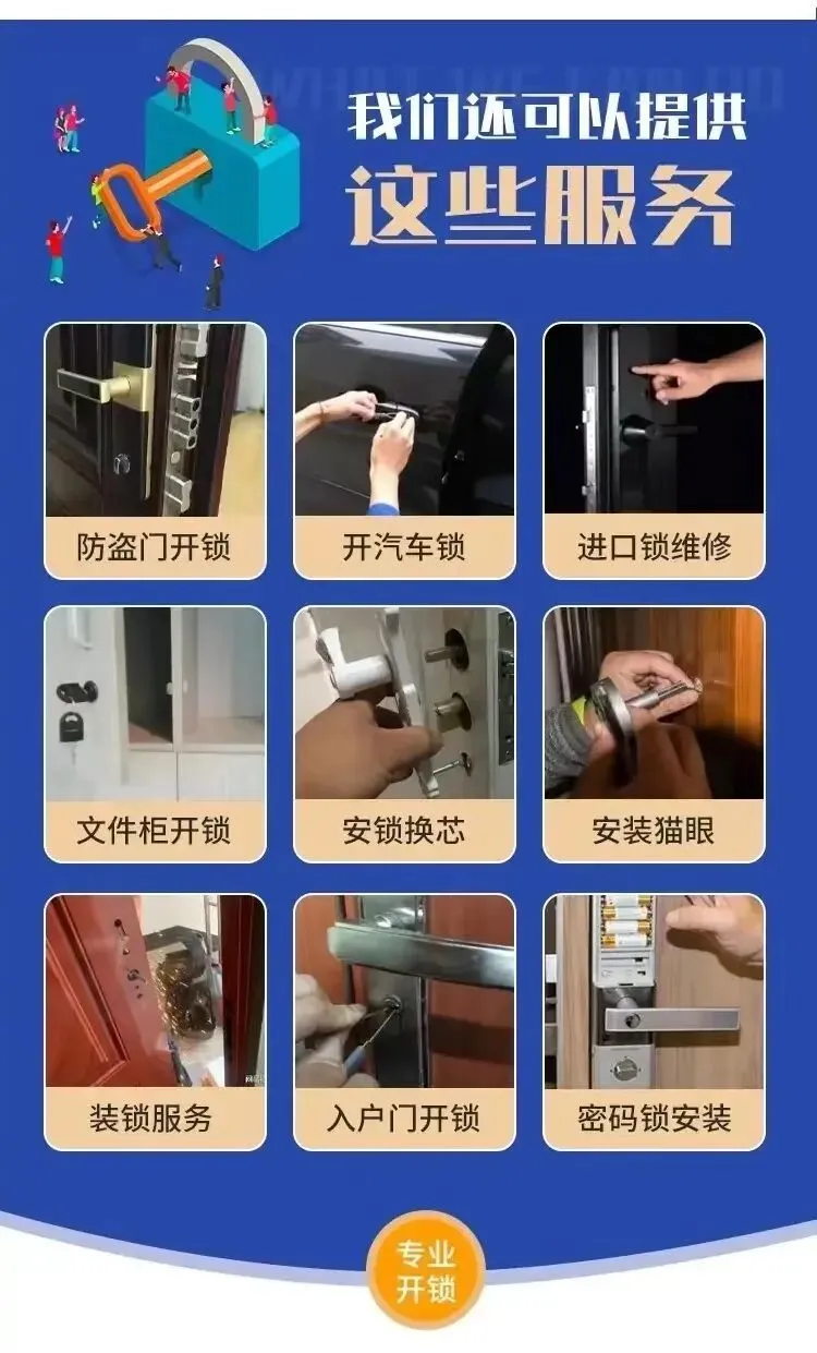🛠️【服务内容】🔓 上门开锁(防盗门、室内门、玻璃门等)🔑 更换锁芯(A级/B级/C级锁芯升级)🚪 安装维修门锁(指纹锁、密码锁、智能锁)🔧 防盗门维修(锁体卡顿、反锁、钥匙断裂)🚗 汽车开锁(无损开启、钥匙匹配)📦 保险柜开锁(忘记密码、无法开启)⚡ 紧急开锁(24小时全天响应)