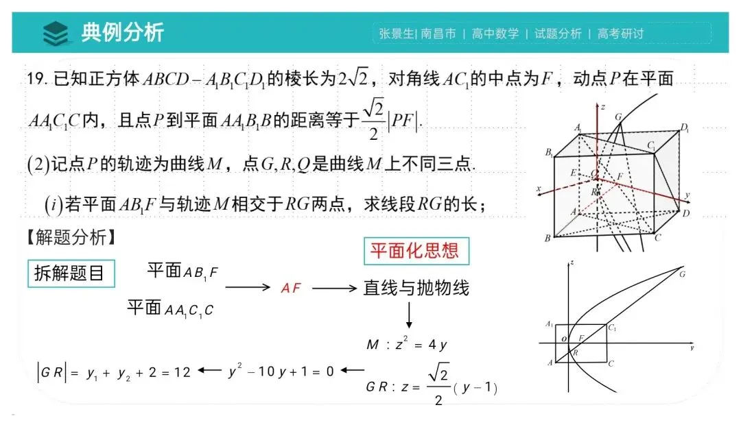 此题从立体几何角度出发,但所有小问都与抛物线息息相关,而更绝的是第三问又能回到立体几何方向的考查,确实处理得很巧妙