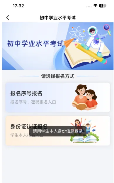 2、如采用“身份证认证报名”方式报名时系统提示“请用学生本人身份信息登录”时,请先确认当前昌通码实名认证信息是否是学生本人,如是学生本人实名认证也无法报名,请联系学校确认考生是否取得报名资格。