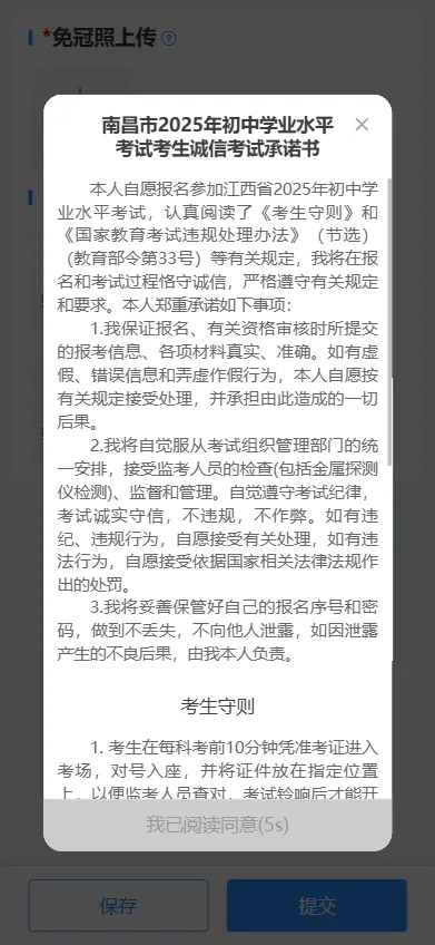 学生阅读【江西省2025年初中学业水平考试诚信考试承诺书】,点击【我已阅读同意】。