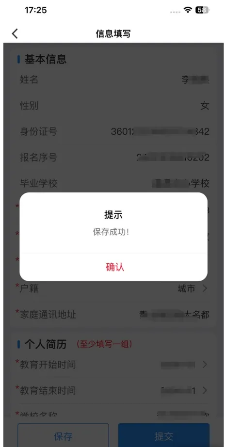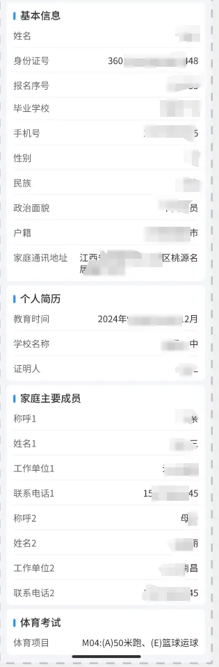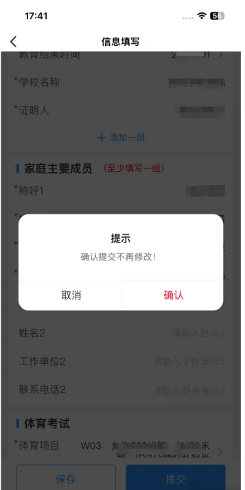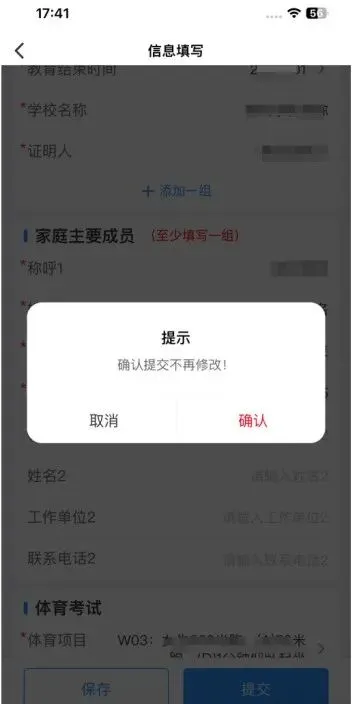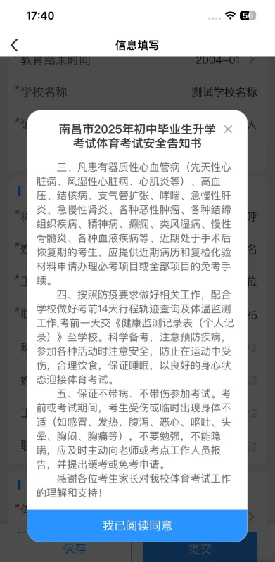 填写基本信息、个人简历、家庭主要成员(必须填写监护人,联系电话必须填写监护人准确的常用手机号码)等信息,点击“保存”并阅读2025年中考体育考试项目安全告知书。