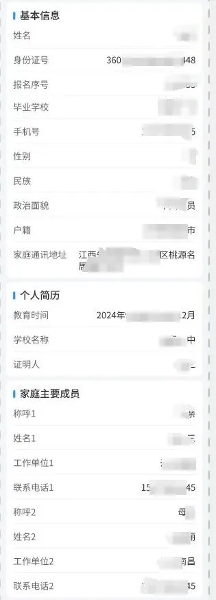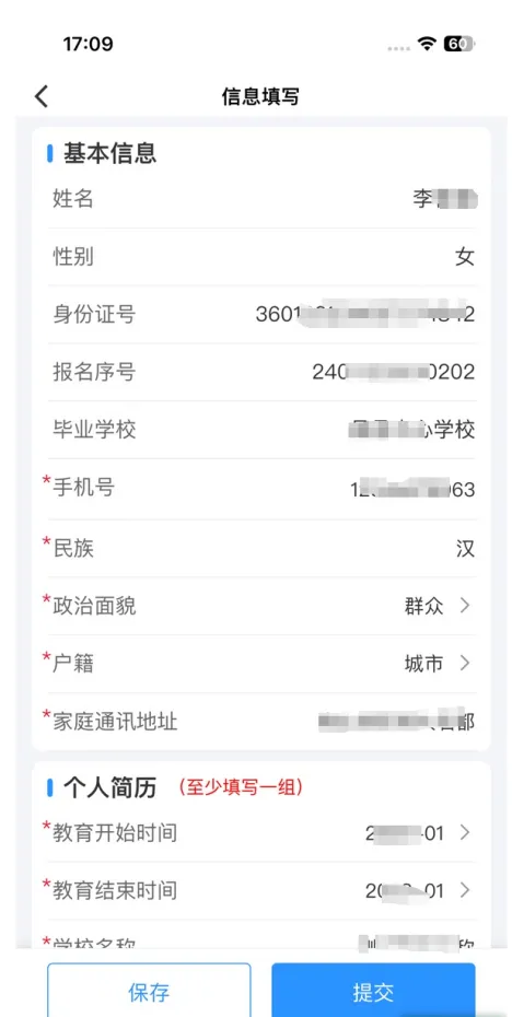 填写基本信息、个人简历、家庭主要成员(必须填写监护人,联系电话必须填写监护人准确的常用手机号码)等信息,点击“保存”。