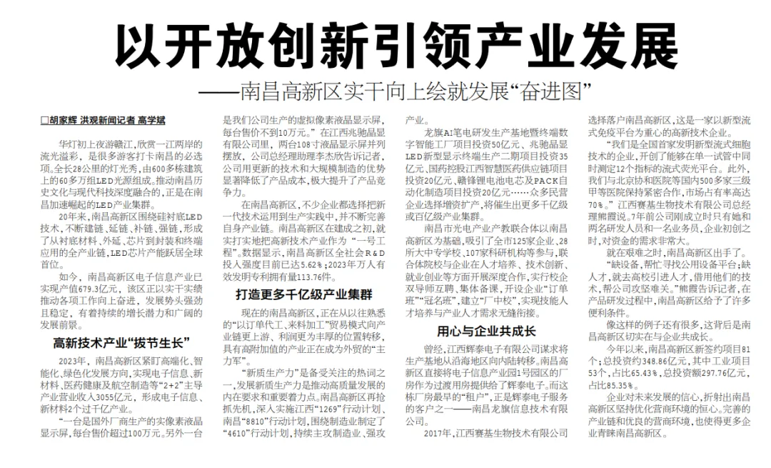 近日,《南昌日报》报道:以开放创新引领产业发展——南昌高新区实干向上绘就发展“奋进图”。