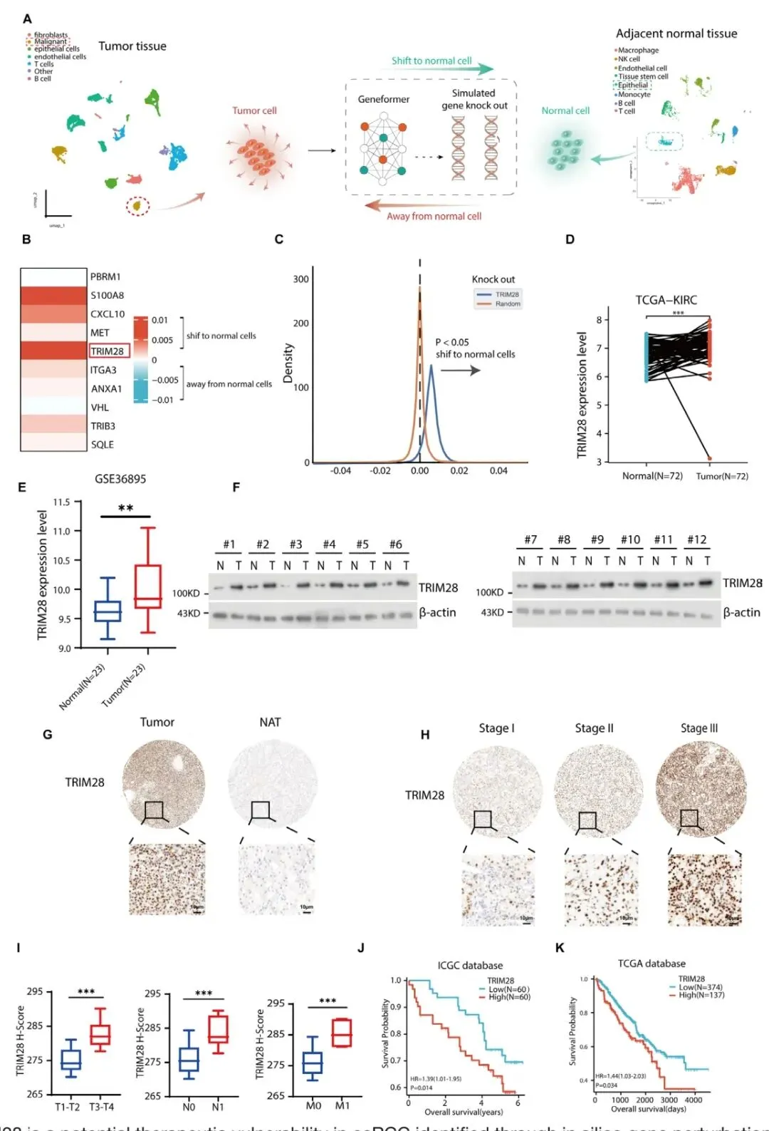 禾苗今天分享的这篇研究的生信部分很有代表性:先用单细胞数据结合 Geneformer 深度学习模型,在 ccRCC 恶性细胞里做虚拟基因敲除筛选,快速锁定 TRIM28 这个新靶点,比传统“表达差异+预后”三板斧更有创新性;随后利用 TCGA、ICGC 等公共队列分析其临床意义与免疫浸润关联,机制层面又借助 SUMOylation 位点预测、ChIP富集分析、代谢组学等多组学手段支撑假说。这种“干实验锁定靶点→湿实验验证机制→虚拟筛选药物”的模式,干湿结合紧密,正好契合当下高分期刊对生信类文章的偏好。未来,像这样用前沿计算方法驱动靶点发现、再结合转化验证的思路,在肿瘤免疫和代谢领域会越来越有竞争力。