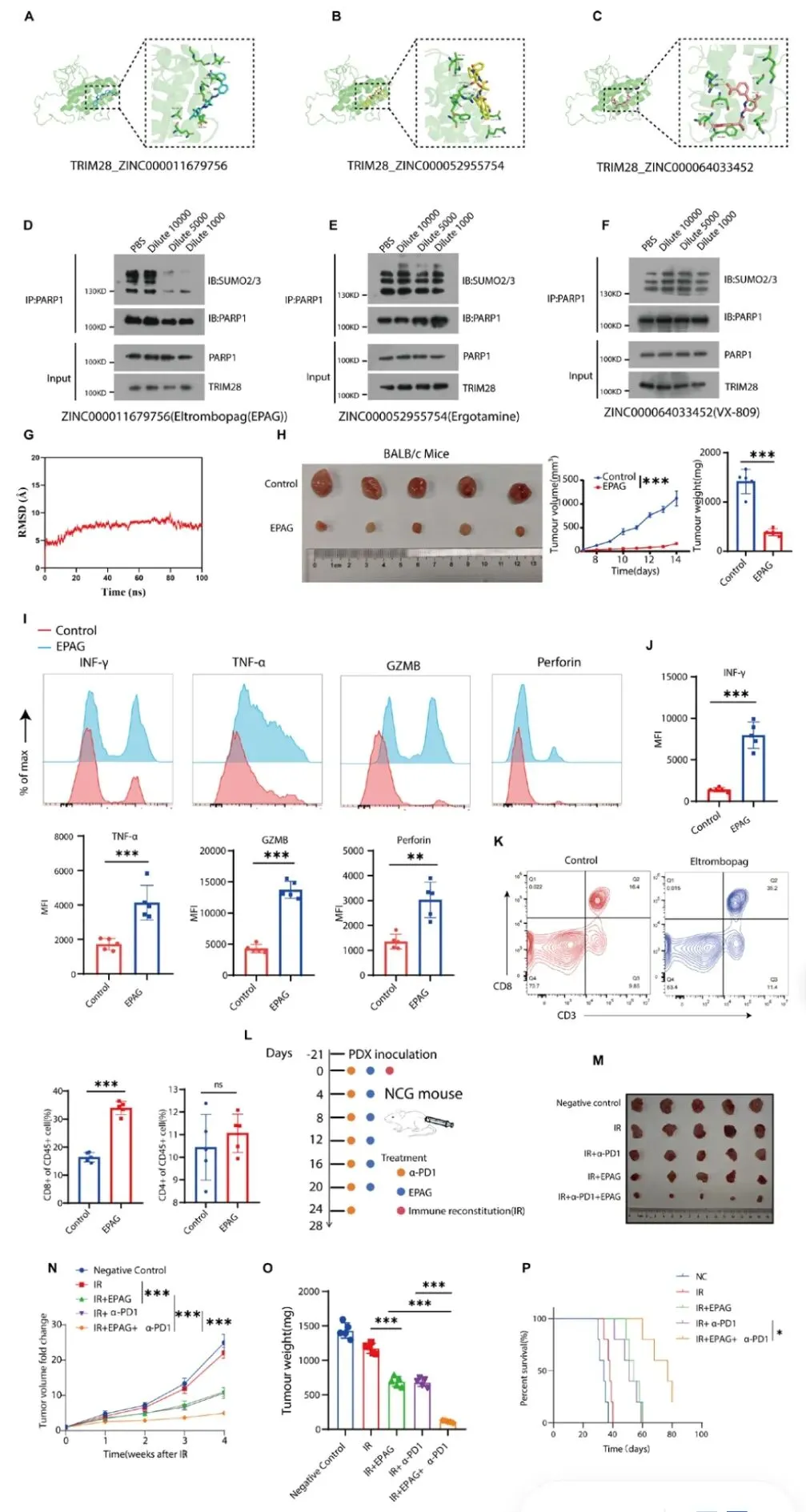 本研究采用多层次的实验方法:首先,利用单细胞转录组数据(GSE159115)结合基于深度学习的 Geneformer 模型,对 ccRCC 恶性上皮细胞进行模拟基因敲除筛选,鉴定出 TRIM28 作为潜在治疗靶点;随后,通过构建 TRIM28 敲低和过表达的稳定细胞系(786-O、CAKI-1、Renca),结合 CD8⁺ T 细胞共培养、流式细胞术、免疫缺陷与免疫健全小鼠异种移植模型,验证 TRIM28 对肿瘤免疫微环境的调控作用;在机制层面,运用免疫共沉淀、GST pull-down、质谱分析、SUMOylation/泛素化实验、染色质免疫沉淀定量 PCR(ChIP-qPCR)以及转录组测序(RNA-seq)和代谢组学(LC-MS/MS),阐明 TRIM28 与 PARP1 的相互作用及其对 NAD⁺ 代谢和 PD-L1 转录的调控机制;最后,通过基于结构的虚拟筛选与分子动力学模拟,鉴定出 TRIM28 小分子抑制剂 Eltrombopag,并在人源化免疫系统小鼠和患者来源异种移植(PDX)模型中评估其与抗 PD-1 联合治疗的疗效。