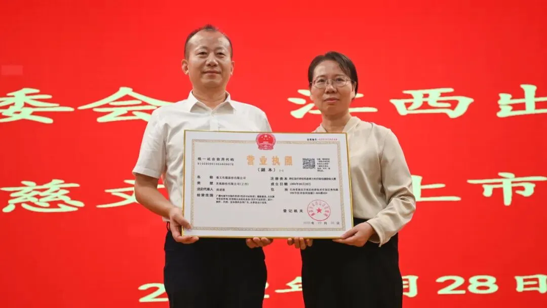 经开区市场监管局局长喻兵(左)给慈文传媒董事长花玉萍(右)颁发慈文传媒新营业执照随后,南昌经开区市场监管局为慈文传媒发放了迁址证照。