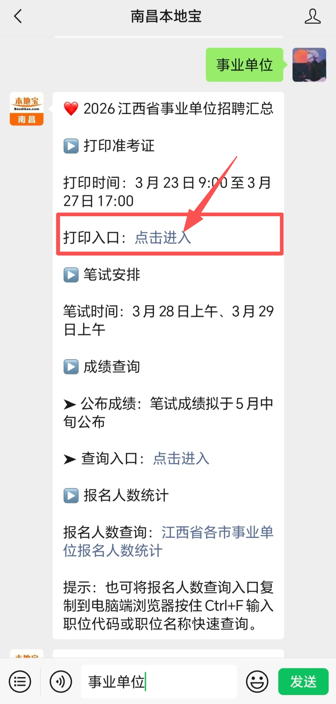 南昌本地宝推出非常多的功能,进入【南昌本地宝】公众号聊天对话框里,点击发消息,在对话框内输入并发送对应的【关键词】即可获取相关内容。