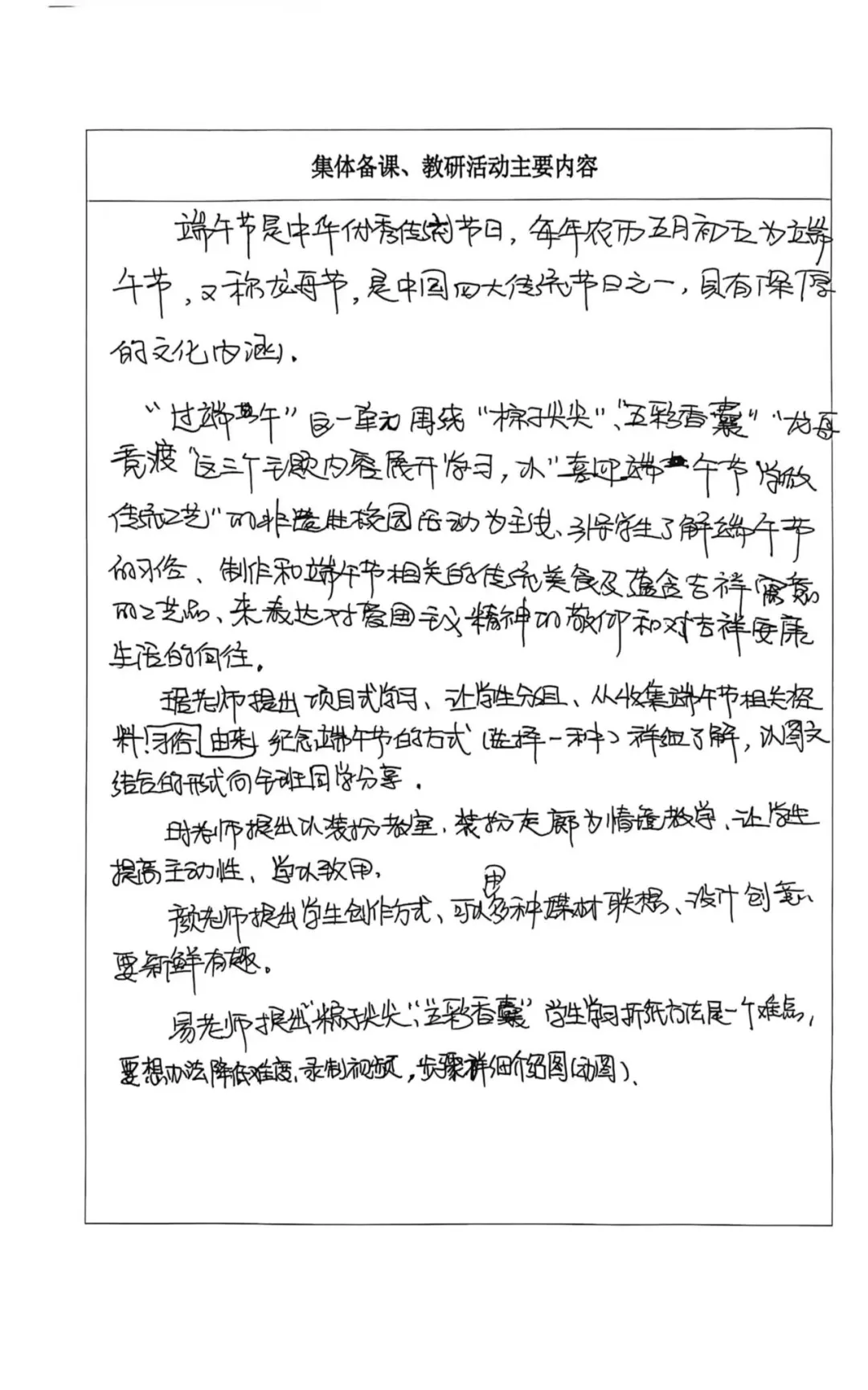 琚老师提出项目式学习,让学生分组、从收集端午节相关格料,习俗的由来,纪念端午节的方式(选择一种)详细了解,以图文结合的形式向全班同学分享。