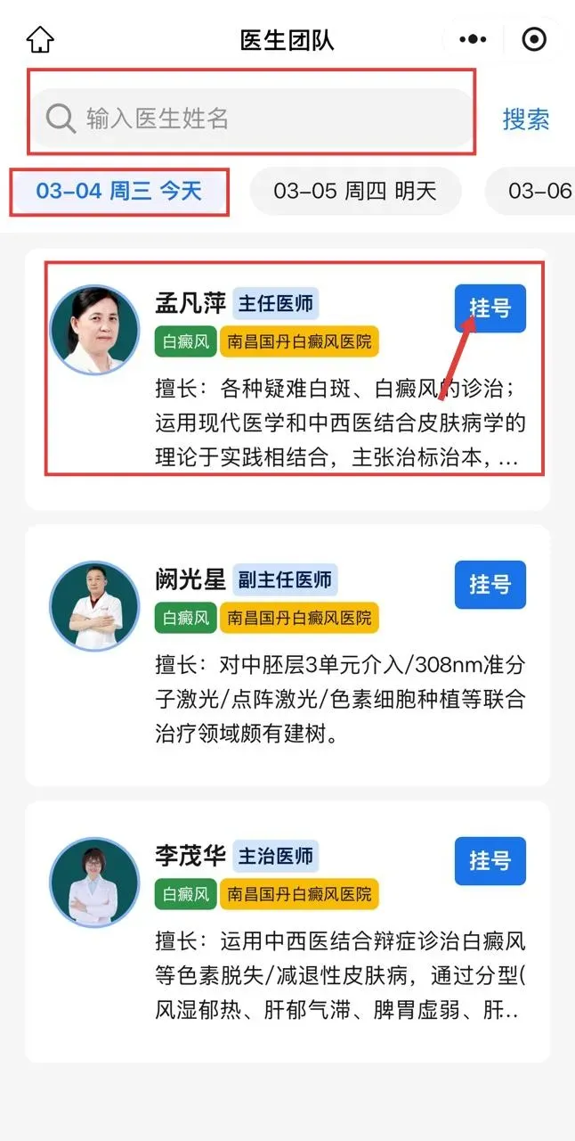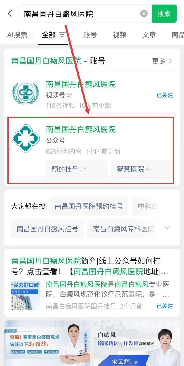 进入微信搜索,“南昌国丹白癜风医院”,点击此公众号进行关注,或点击封面“预约挂号”。