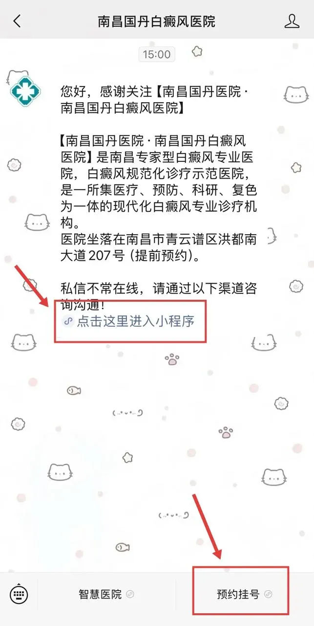 关注“南昌国丹白癜风医院”点击私信,点击“点击这里进入小程序”或点击最下方“预约挂号”。
