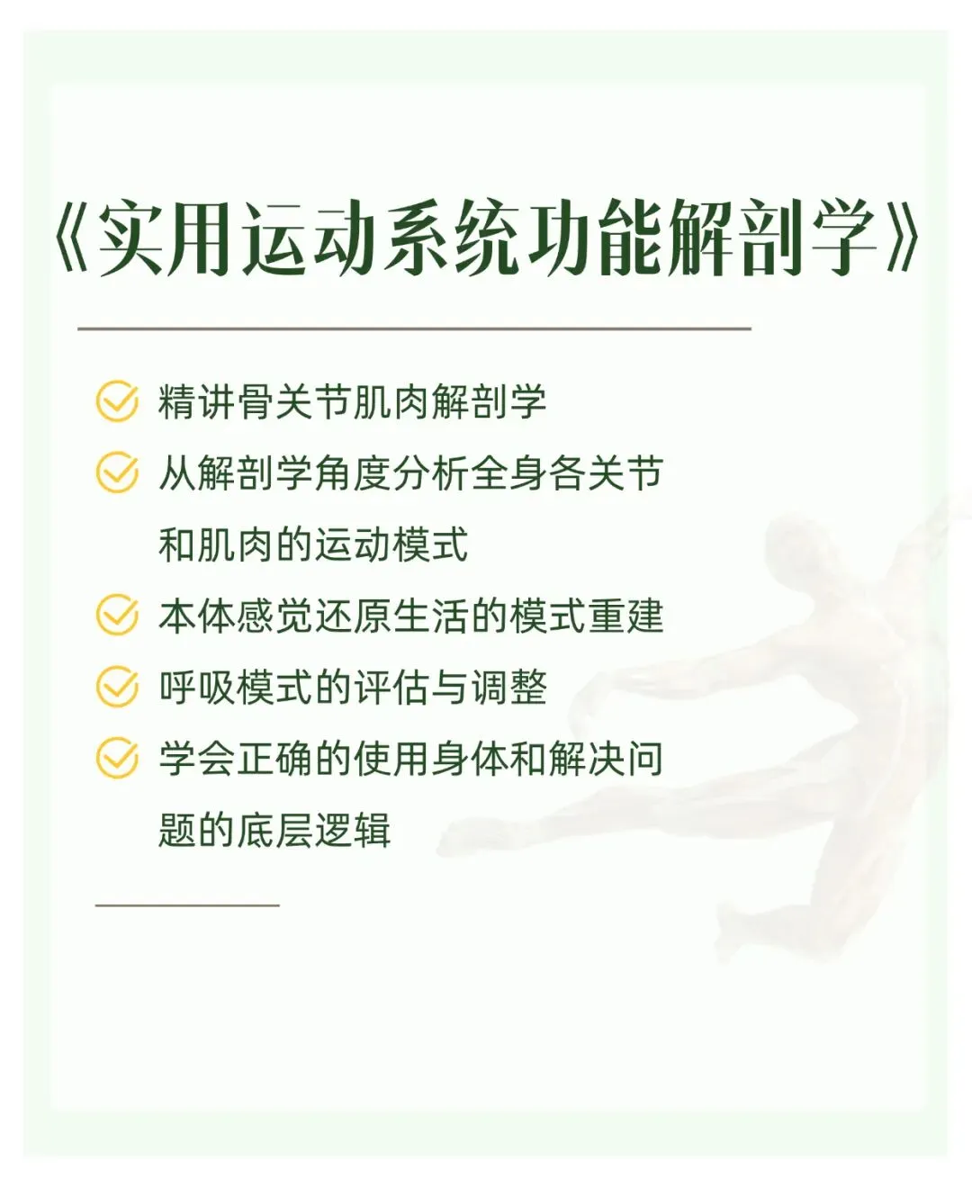 《实用运动系统功能解剖学》课程是全面详细学习运动系统中的:骨、骨连结、骨骼肌。通过对人体基本结构的熟练掌握来帮助我们更好的理解各种运动体系或者训练动作对身体的影响,是一切训练或者康复技术的底层知识,所以优先学习解剖知识不仅可以帮助我们更好的了解自己的身体,而且还能让我们学习其它各种技术都游刃有余。