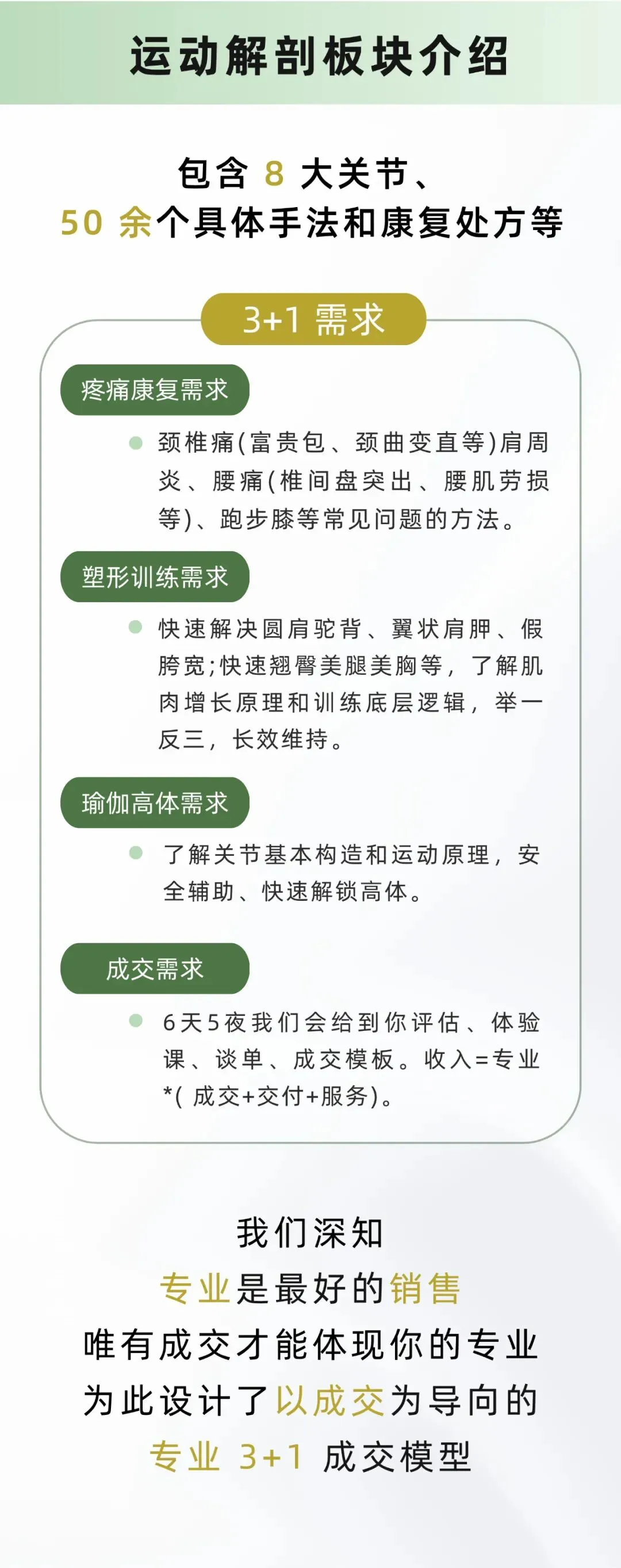 如:青少年长高的秘密不同年龄阶段的私教训练指南如何高效减脂塑形无痛开髋、开肩解锁更多高难度姿势肩肘腕髋膝踝 常见活动受限和疼痛私教处理解读核心。