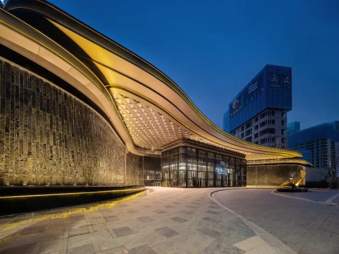 约 118 米的大门并未追求过度张扬,而是以幻影蓝奢石与古铜色铝板勾勒江浪肌理,内凹退让约13米,酒店式环岛落客区,庄重体面,归家仪式感更强。