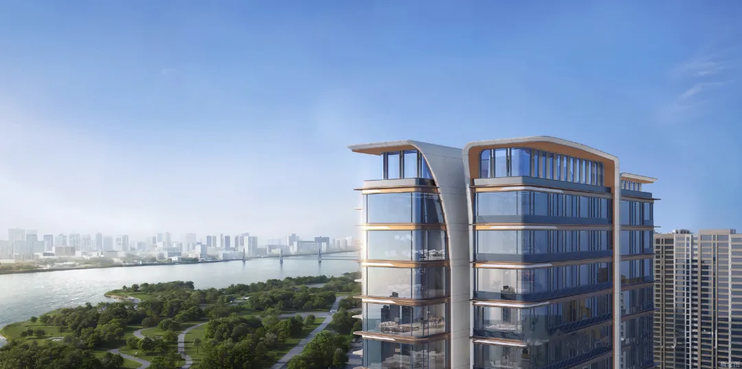 全公建化立面摒弃浮夸符号,以「江帆」为灵感的 S 型线条,搭配超白高透中空 LOW-E 钢化玻璃与银灰色铝板,如江上行舟,与赣江景致浑然一体,历久弥新的颜值,经得起时间的挑剔。